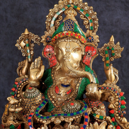 Brass Ganapathi Statue with Mouse 12 inch with stonework