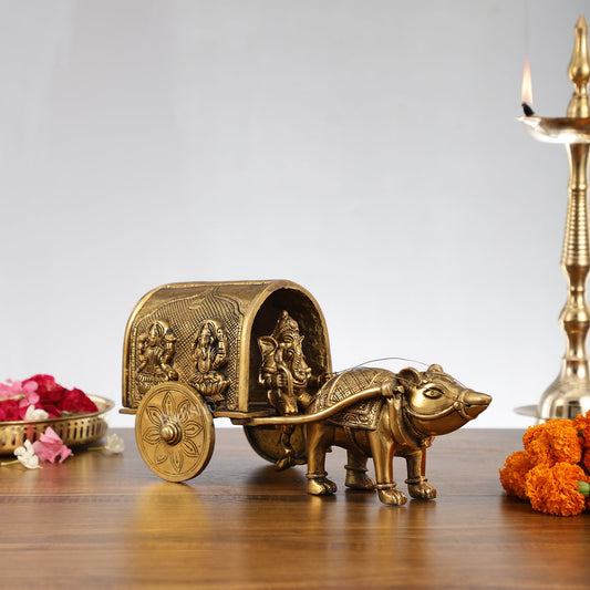 Brass Ganapati on Mooshak Rath idol with Modak Bowl | Engraved Cart with Ganesha and Lakshmi | length 13 inch