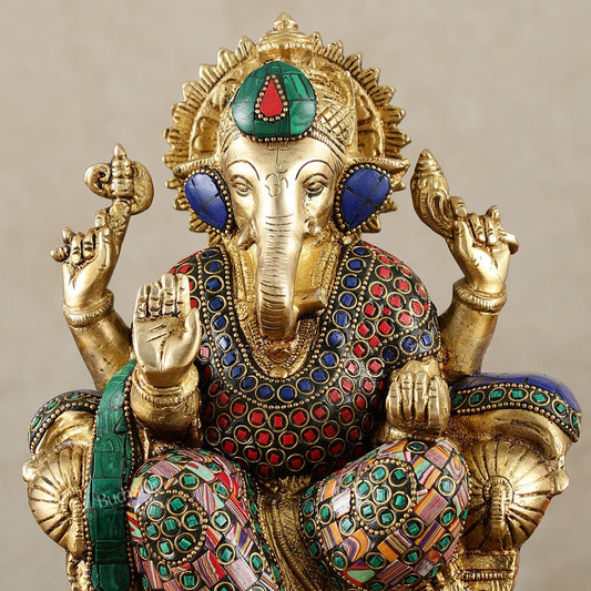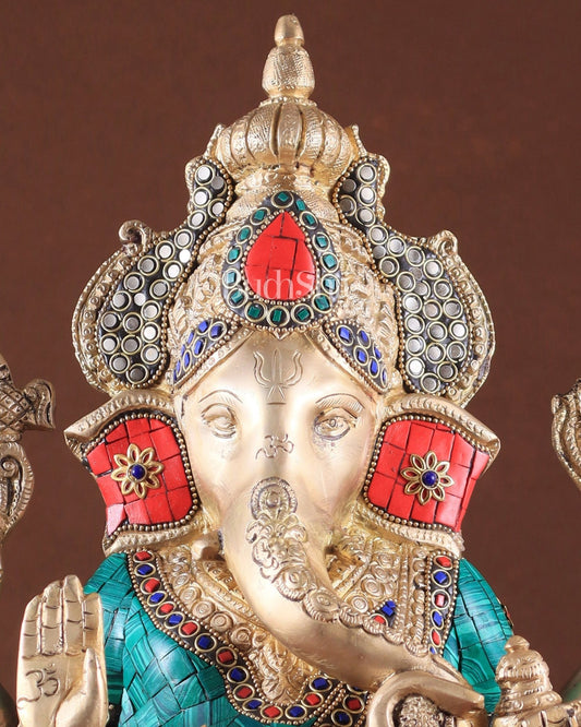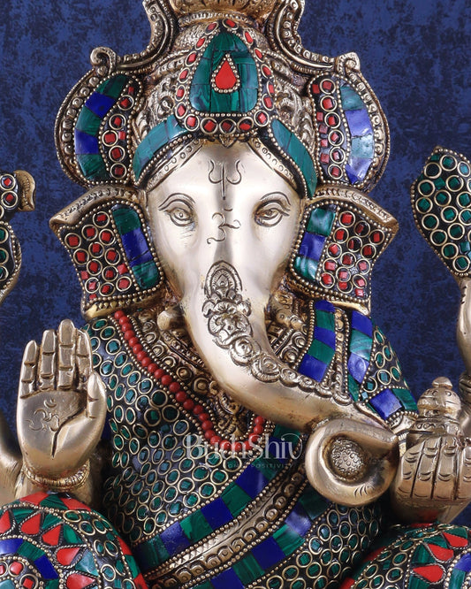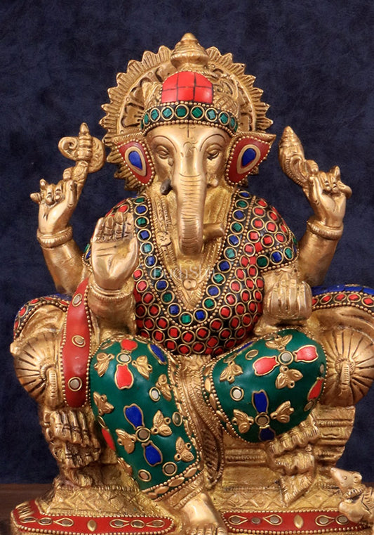 Brass Ganesha Idol with Meenakari Stonework - 12"
