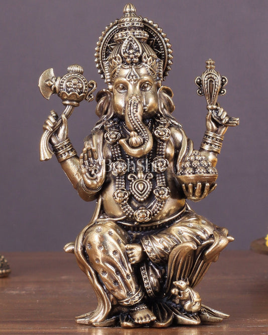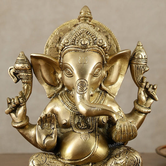Brass Ganesha Idol with Sharp Features - 8 Inch