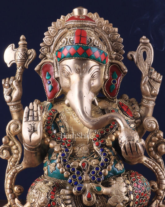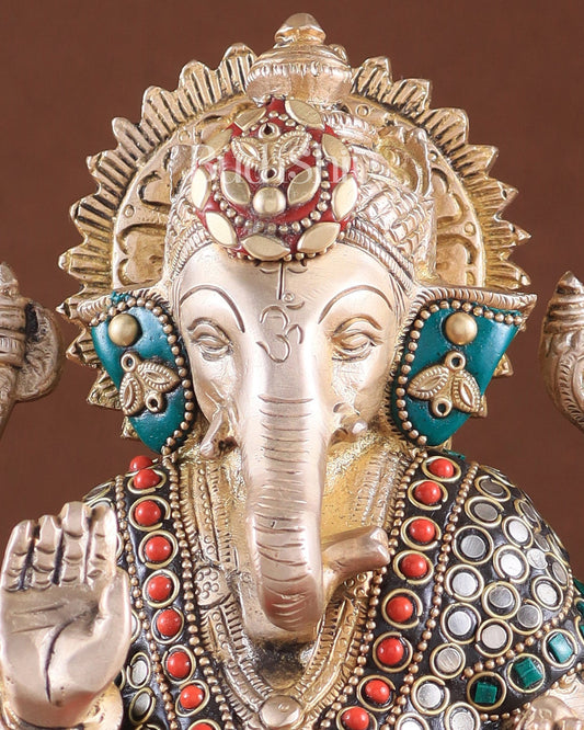 Brass Ganesha Idol with Meenakari Stonework | 10" Height | Vibrant
