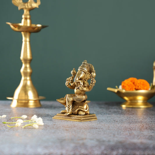 Brass Ganesha sitting on mouse idol 5"