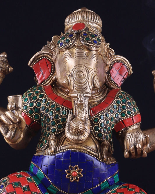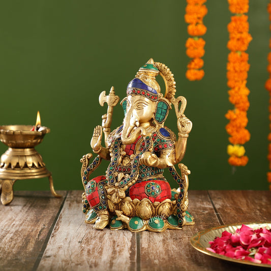 Brass Ganesha Seated on Lotus Base idol with stonework | 10.5"