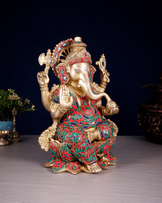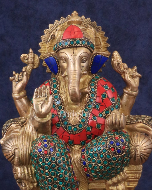 Brass Ganesha Statue with Natural Stone Embellishments - 17.5" Height