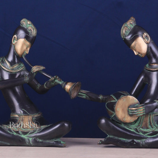 Brass Tribal Musician Pair - Shehnai and Dholak Players - Handcrafted Showpieces