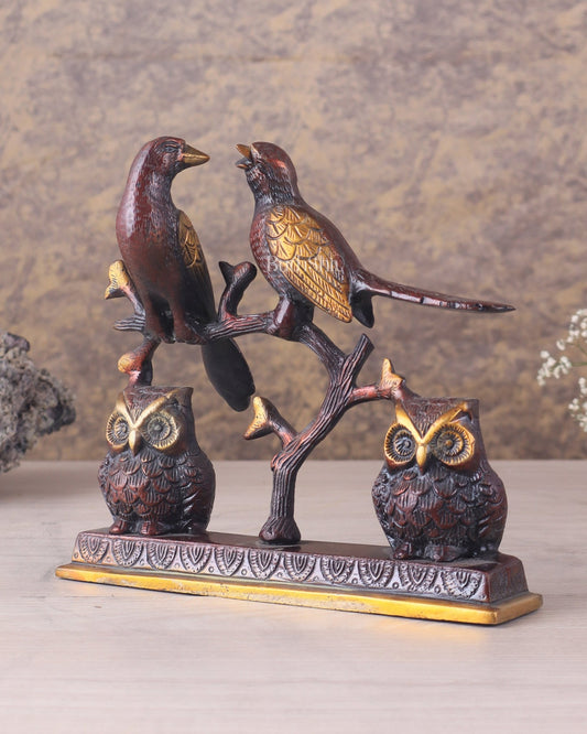 Pure Brass Vintage Tone Pair of Owls with Pair of Pigeons – Vastu Approved Showpiece 8.5"