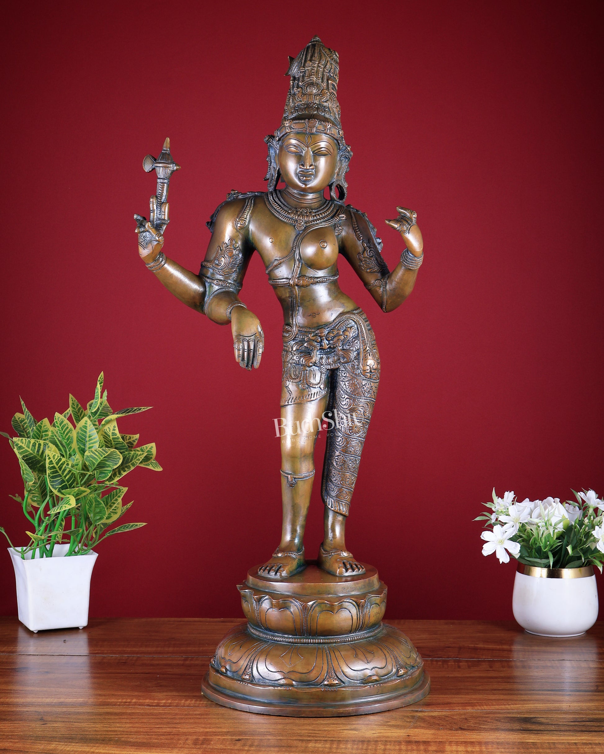 Embrace divine balance with our 27” superfine brass Ardhanarishwara statue in vintage Chola bronze tone. Symbolizing the union of Shiva and Parvati, this intricately detailed piece measures 27” x 12” x 8.5” (68.6 cm x 30.5 cm x 21.6 cm) and weighs 14 kg—ideal for spiritual décor and sacred spaces.