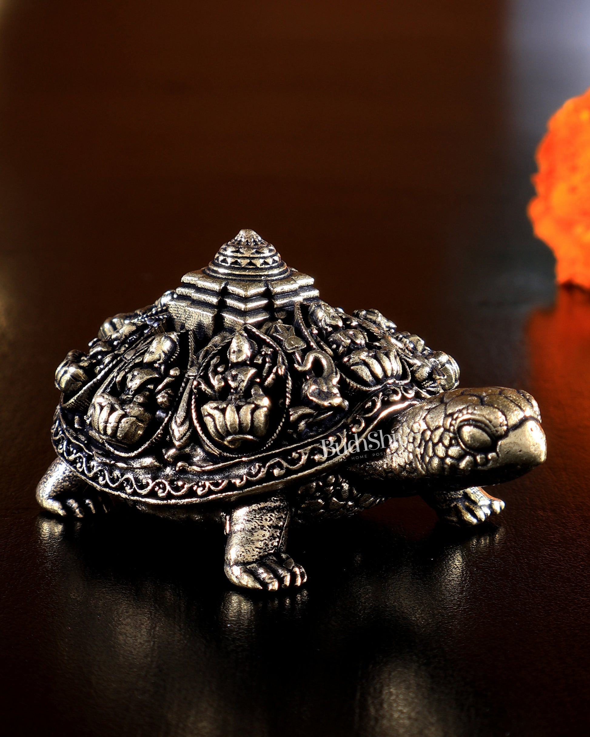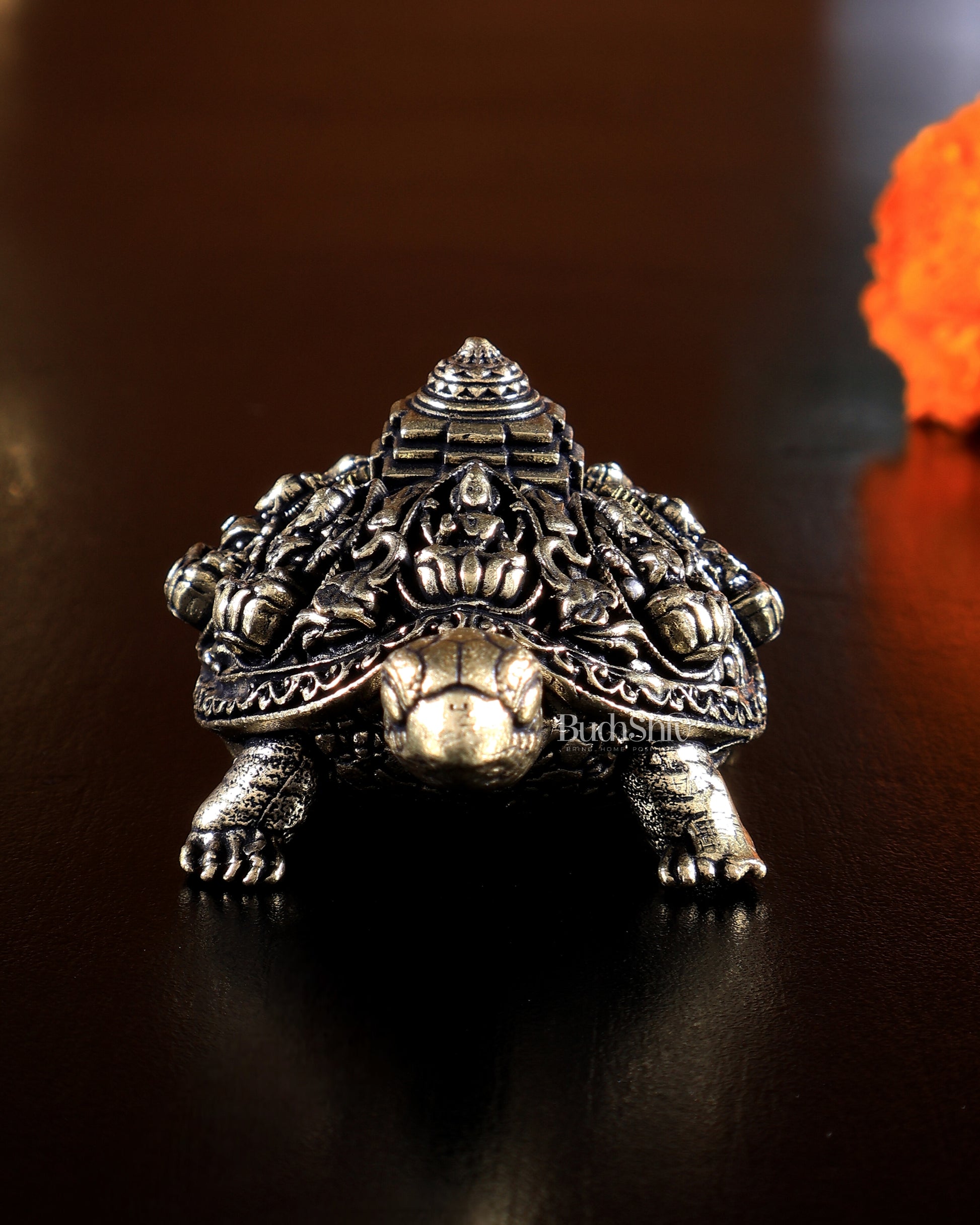 Superfine Brass Ashtalakshmi Tortoise miniature idol with Shree Yantra engraving for wealth and prosperity. Size 3 x 1.75 x 1.25 inches, weight 70 gms. Ideal for vastu remedies.