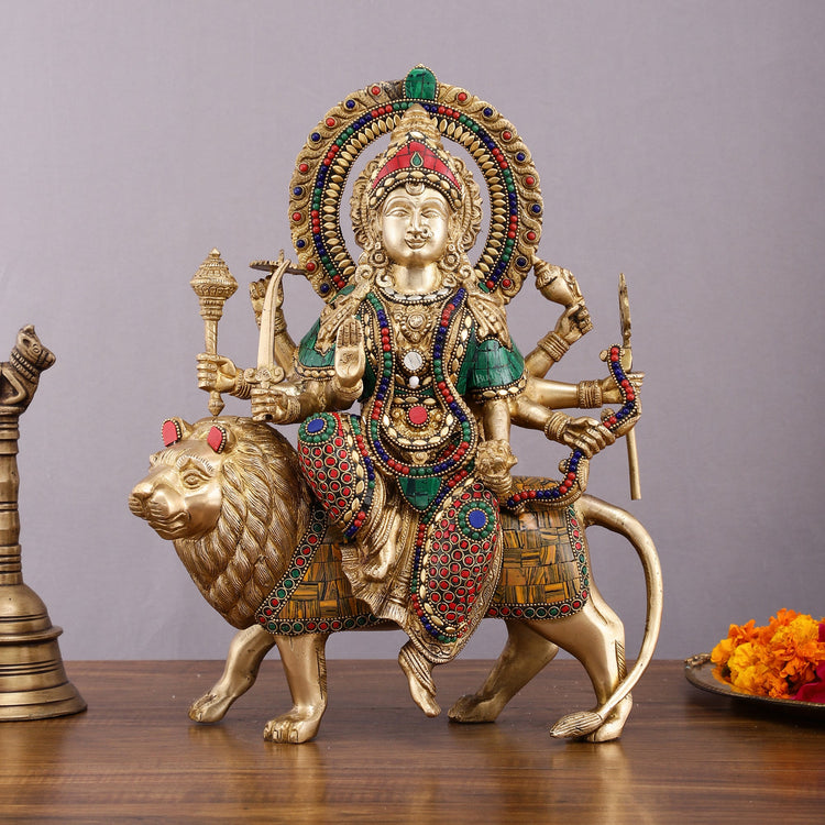 Discover the divine power of the Brass Durga Mata Idol, showcasing Goddess Durga's strength and compassion. Standing 15 inches tall, 11 inches wide, and 5 inches deep, this 10 kg idol is adorned with intricate Meenakari Stonework. Perfect for your home or sacred space.