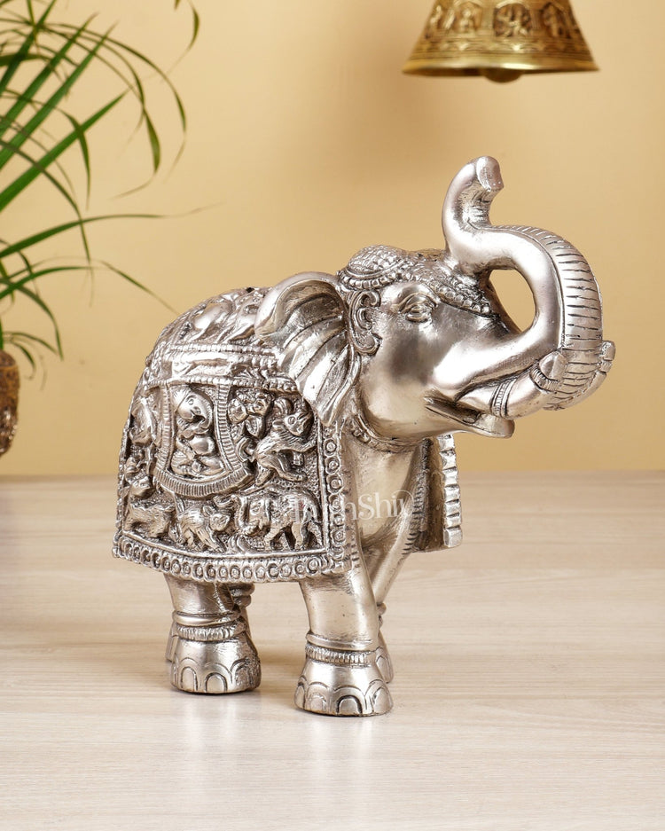 Add an exquisite touch to your home decor with this beautifully handcrafted and fully engraved Brass Elephant Statue with silver plating. Meticulously carved with perfection, this statue showcases exceptional craftsmanship and attention to detail.