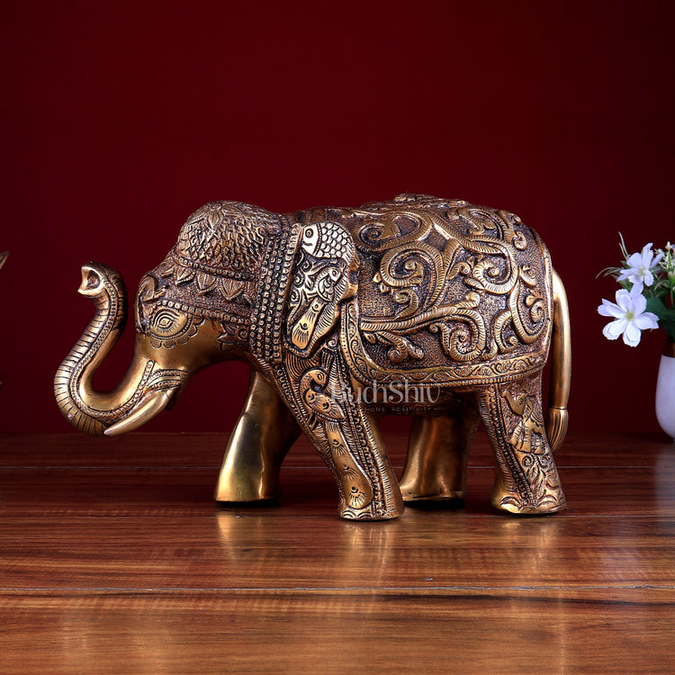 This Brass Elephant Statue with Animal Motif Carvings is a richly detailed decorative artefact symbolizing strength, wisdom, protection, and prosperity. The elephant form is enhanced with intricately carved representations of a lion, peacock, fish, deer, and baby elephant, each carrying deep symbolic meaning in Indian art and tradition.