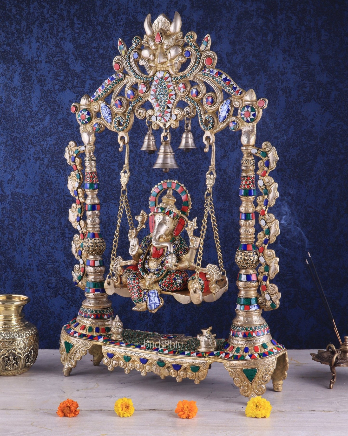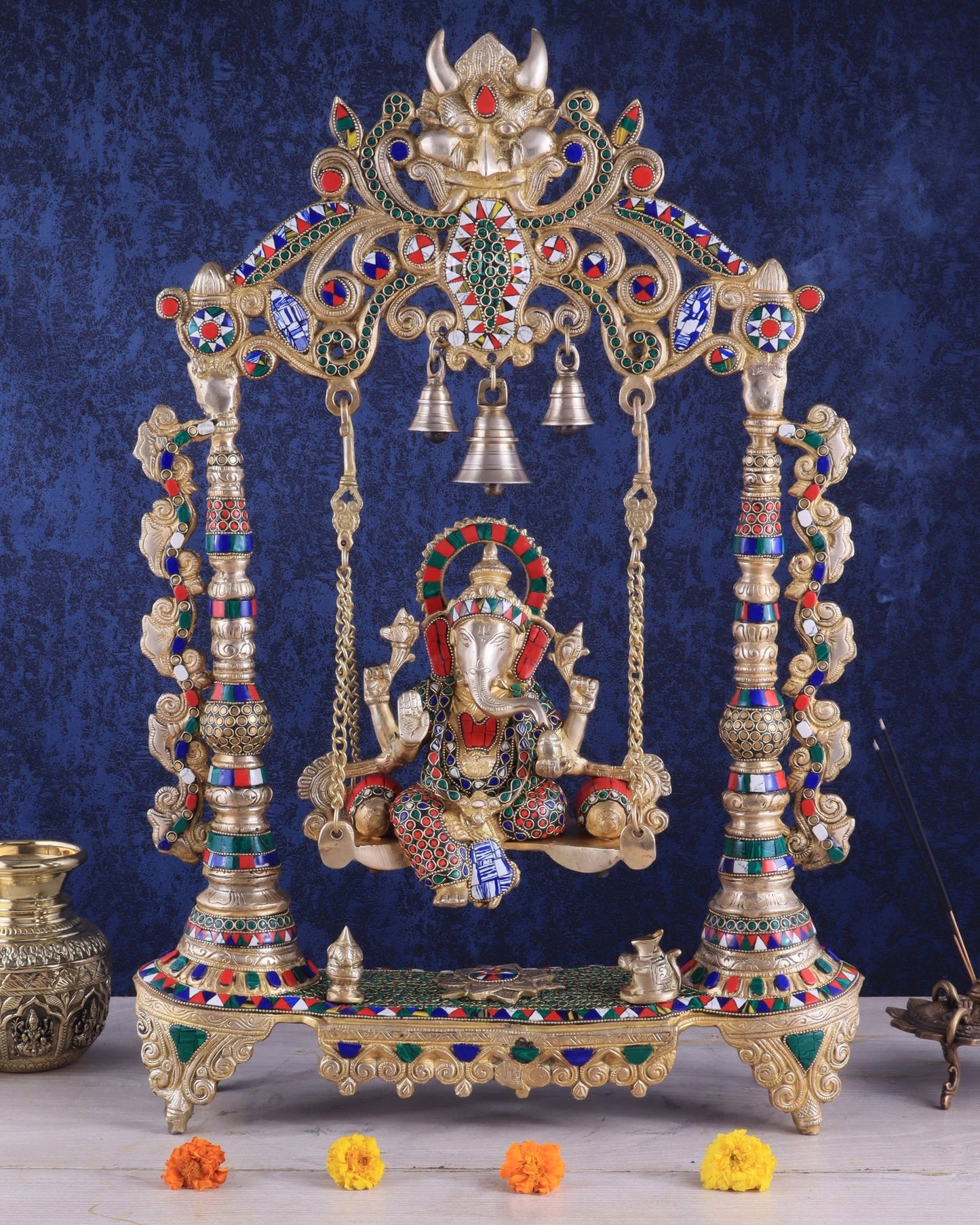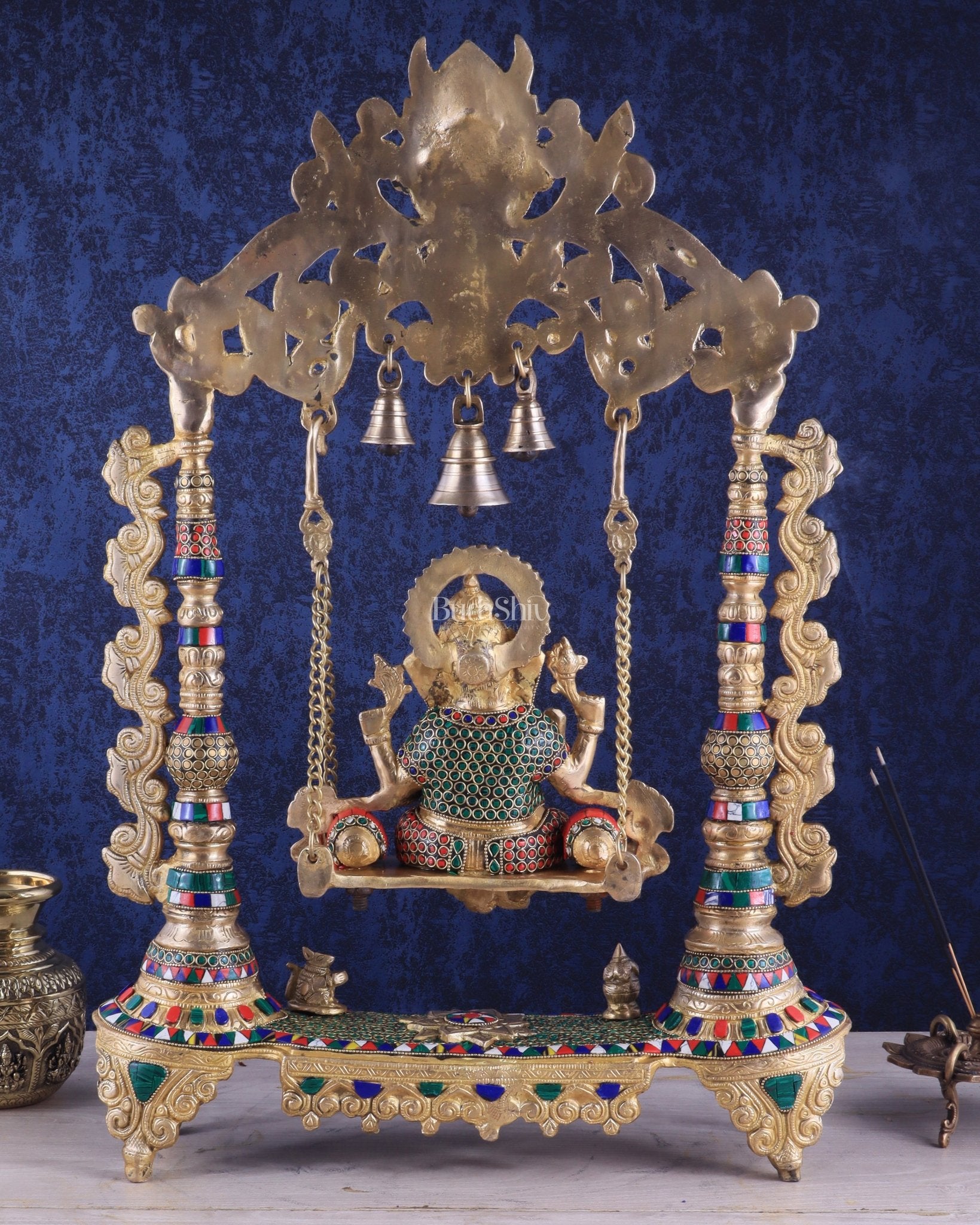 Elevate your sacred space with our meticulously crafted Ganesha Swing. This masterpiece showcases exceptional craftsmanship and bright facial expressions, bringing life to Lord Ganesha. Ideal for temples or home altars, experience the blessings of the remover of obstacles. Dimensions: 26x18.5x5 inches, just the ganesha height is 9 inch, Providing both attention-commanding presence and stability.