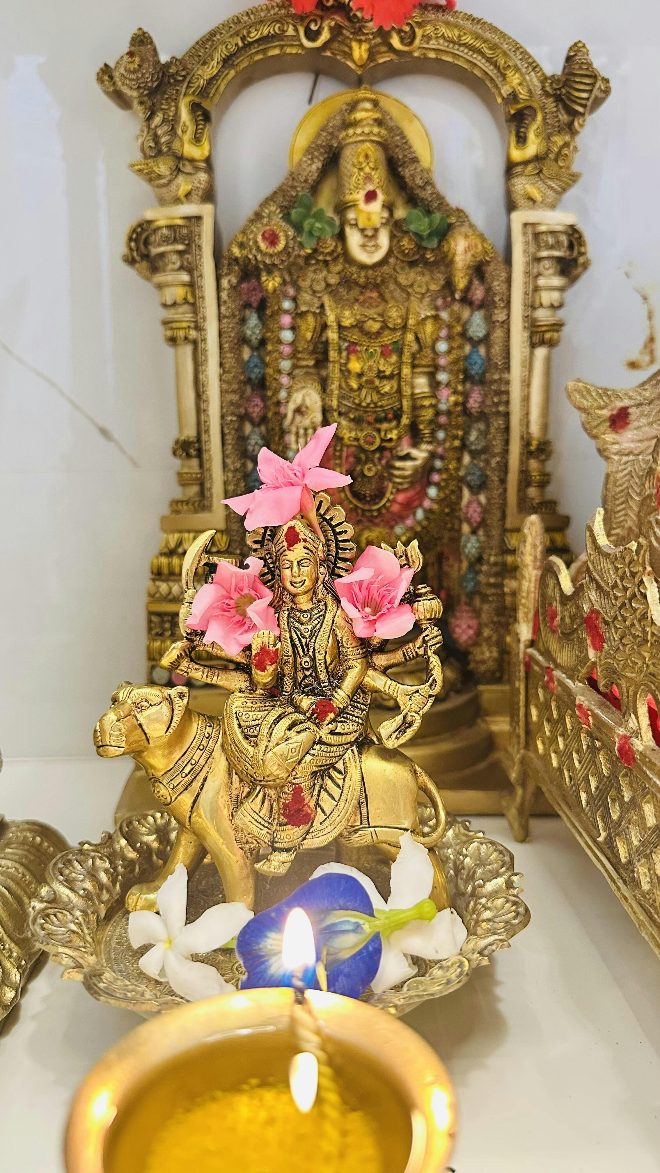 Experience divine strength with our Superfine Brass Goddess Durga Seated on Tiger Idol. Standing at 5 inches, with a width of 4 inches, and a depth of 1.3 inches, this intricately crafted masterpiece captures the fierce and protective presence of Goddess Durga.