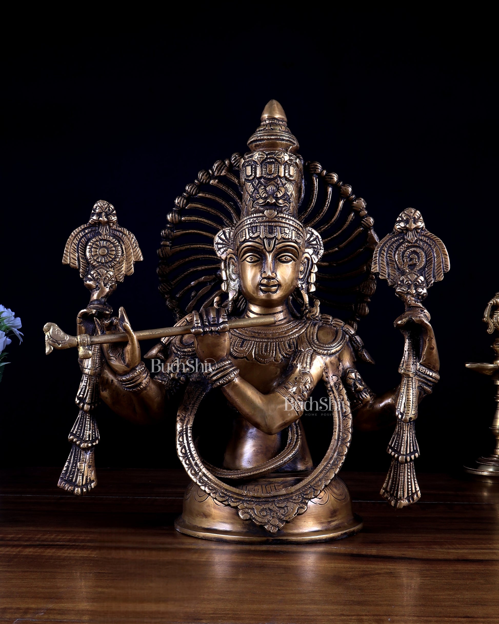 Brass Half Body Lord Krishna Bust Table Accent. Standing at 13.5 inches, with a width of 12 inches, a depth of 4 inches, and a weight of 8.8 kgs.