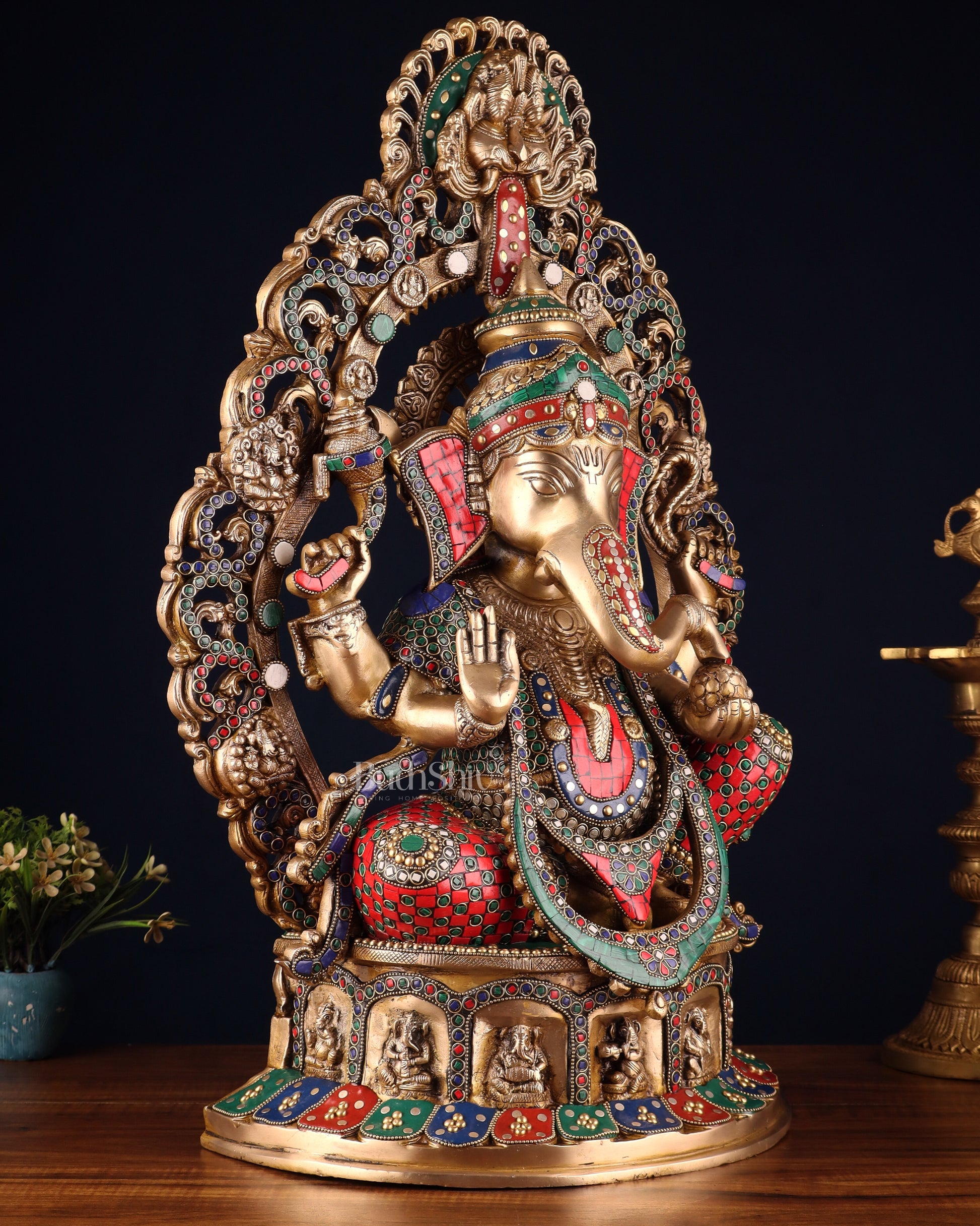 Our exquisite Brass Handcrafted Superfine Lord Ganesha Statue with stonework seated on an Engraved base with ashtavinayaka carvings and unique Prabhavali. Standing at 26 inches, with a width of 16 inches, a depth of 8 inches, and a substantial weight of 28 KG