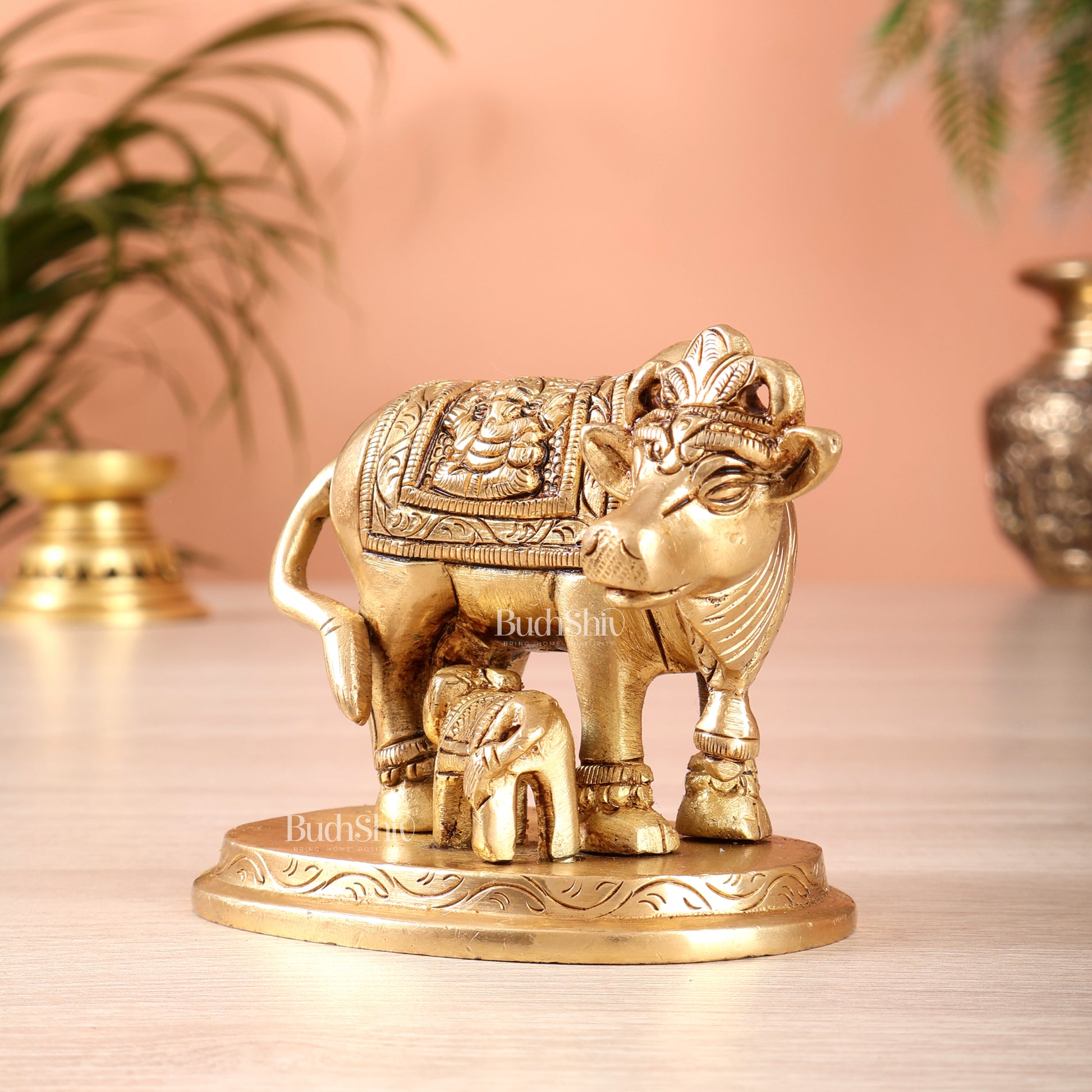 Brass kamdhenu Cow with Calf Idol 3" with ganesh lakshmi carvings