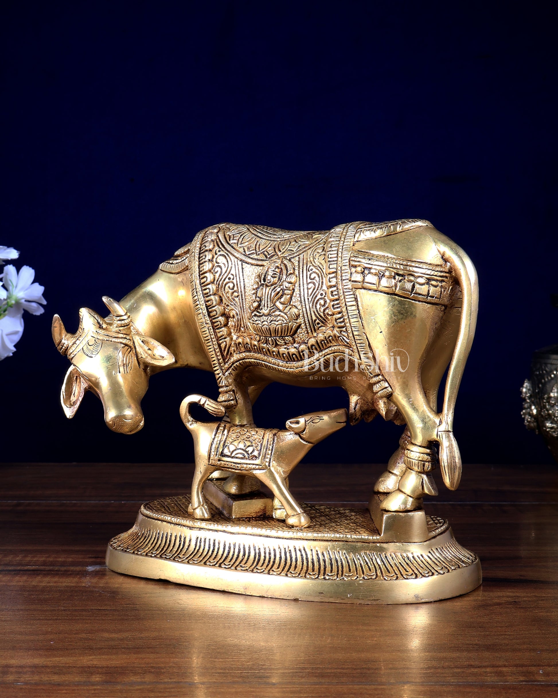 Brass Kamdhenu Cow with Calf Idol – Ganesha & Lakshmi Carvings 7.5 inch