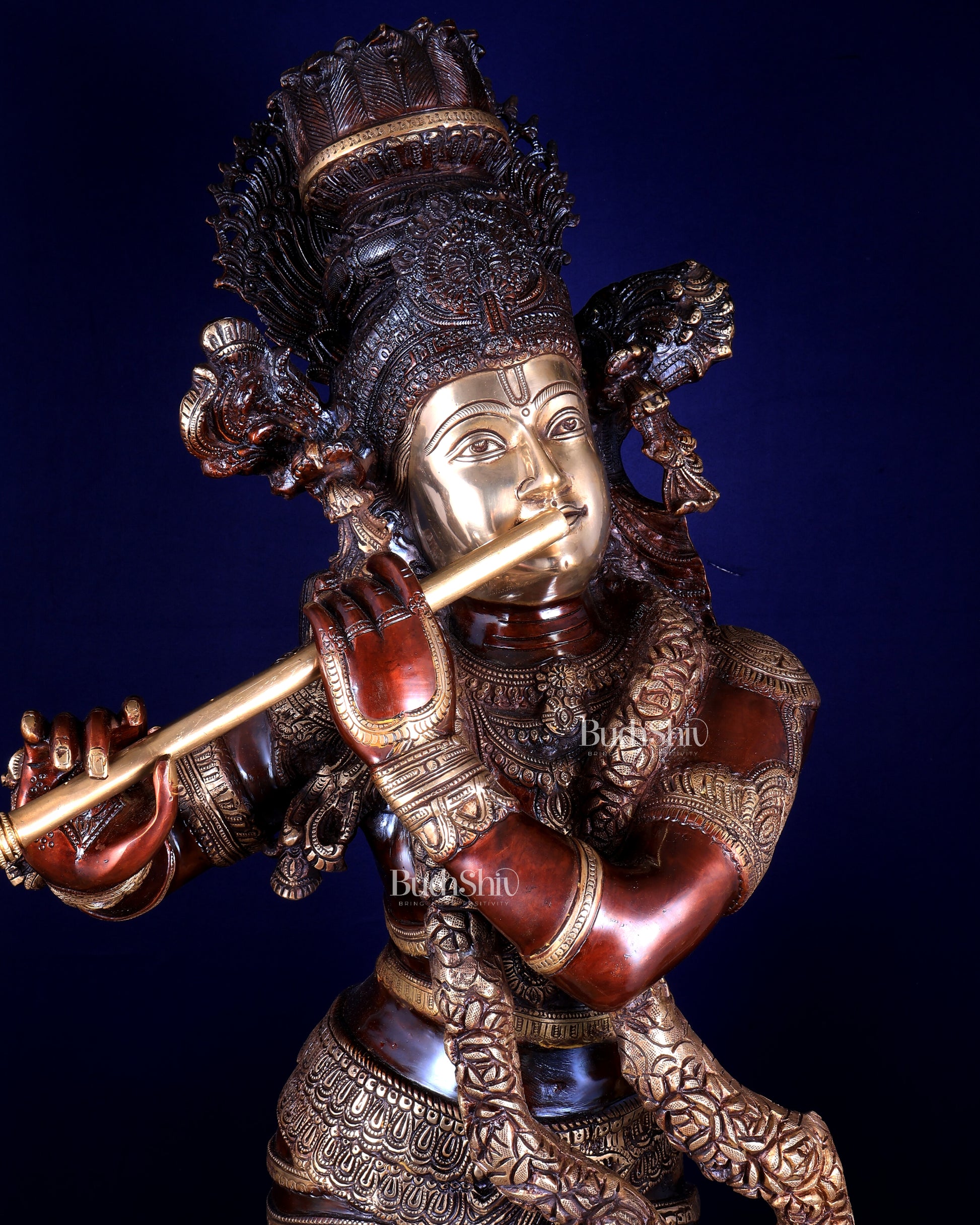 Superfine Brass Large Krishna Statue with a dual glossy copper and golden tone. Standing at 46 inch , width 22 x Depth 13 inches and a weight of 66 kilograms, this masterpiece brings the spiritual essence of Lord Krishna into your surroundings.
