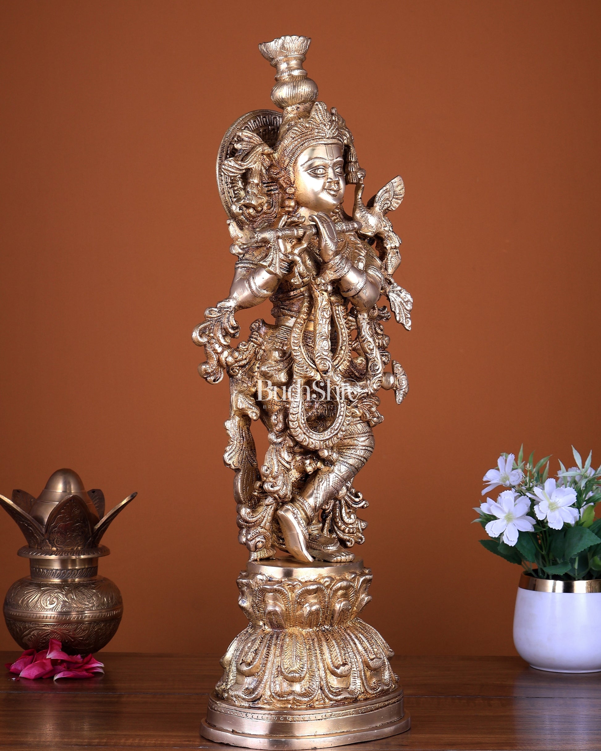 This Brass Krishna Statue with Sharp Features is a refined depiction of Lord Krishna, embodying grace, charm, and divine serenity. The sculpture stands out for its well-defined facial features, balanced proportions, and elegant posture, giving it a striking yet calm presence.