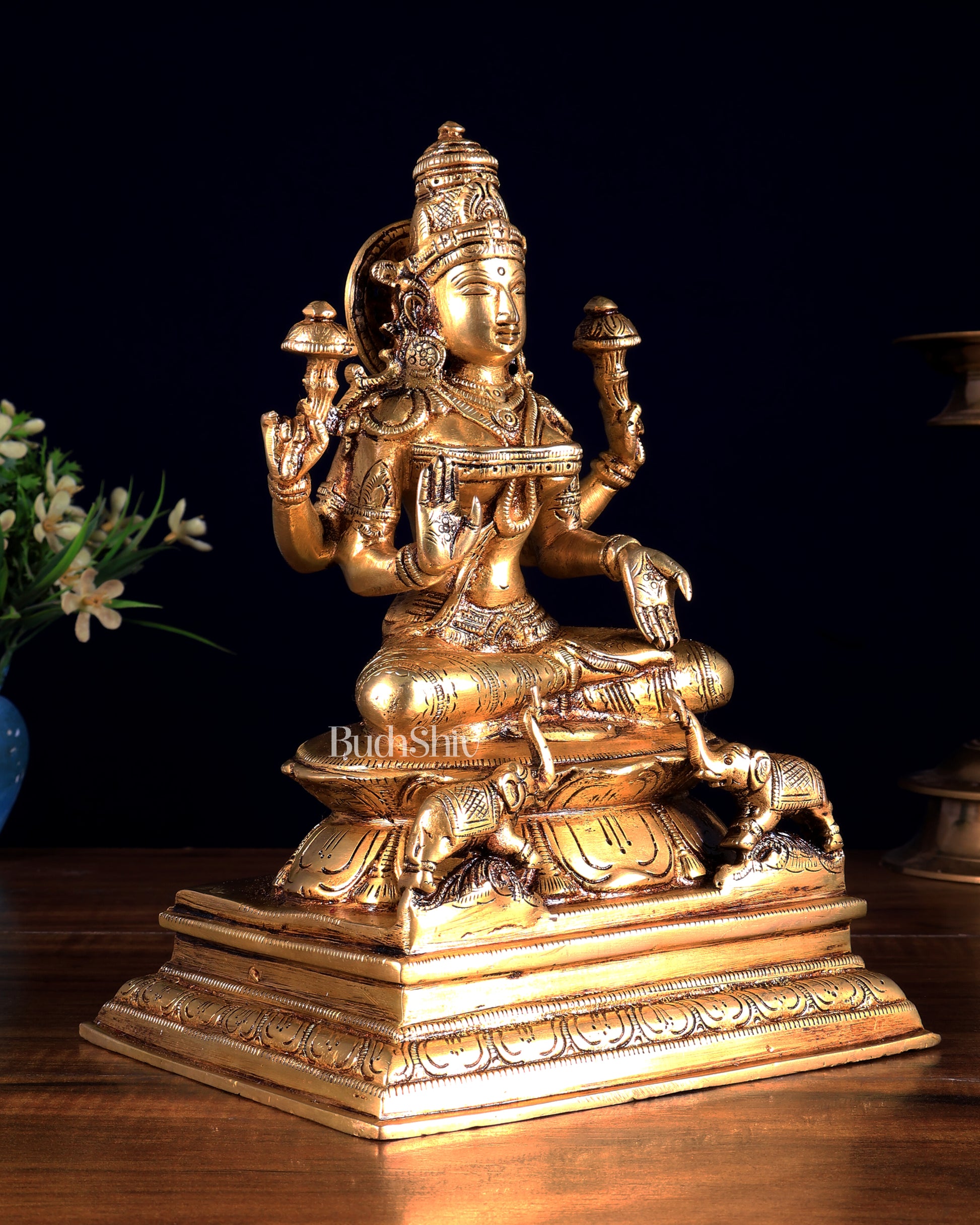 Invite wealth, prosperity, and divine abundance into your home with this Brass Lakshmi Idol with two elephans, exquisitely handcrafted in superfine solid brass. Goddess Lakshmi, the giver of fortune and well-being, is beautifully sculpted with serene expressions and intricate detailing, radiating auspicious energy and grace.