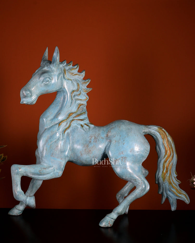 Brass Large Galloping Horse Sculpture | Aqua Blue Tone Patina 30 inch