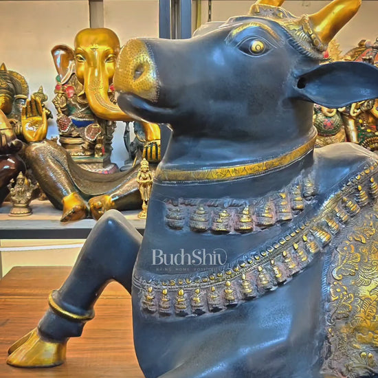Add a touch of elegance to your home decor with this beautiful Brass Antique Large Nandi Sculpture with an ink black and Golden tone, giving it a vintage look. This sculpture is perfect for adding a traditional touch to your home, office, or temple.