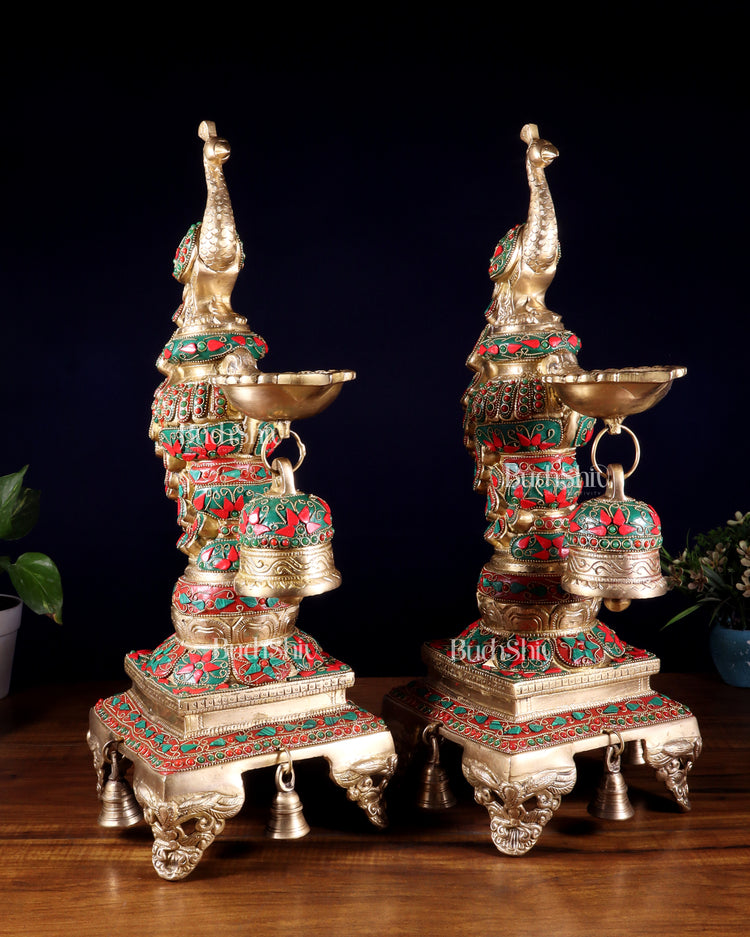 Brass Large Peacock Diya with Meenakari Stonework | 19-Inch Traditional Oil Lamp pair