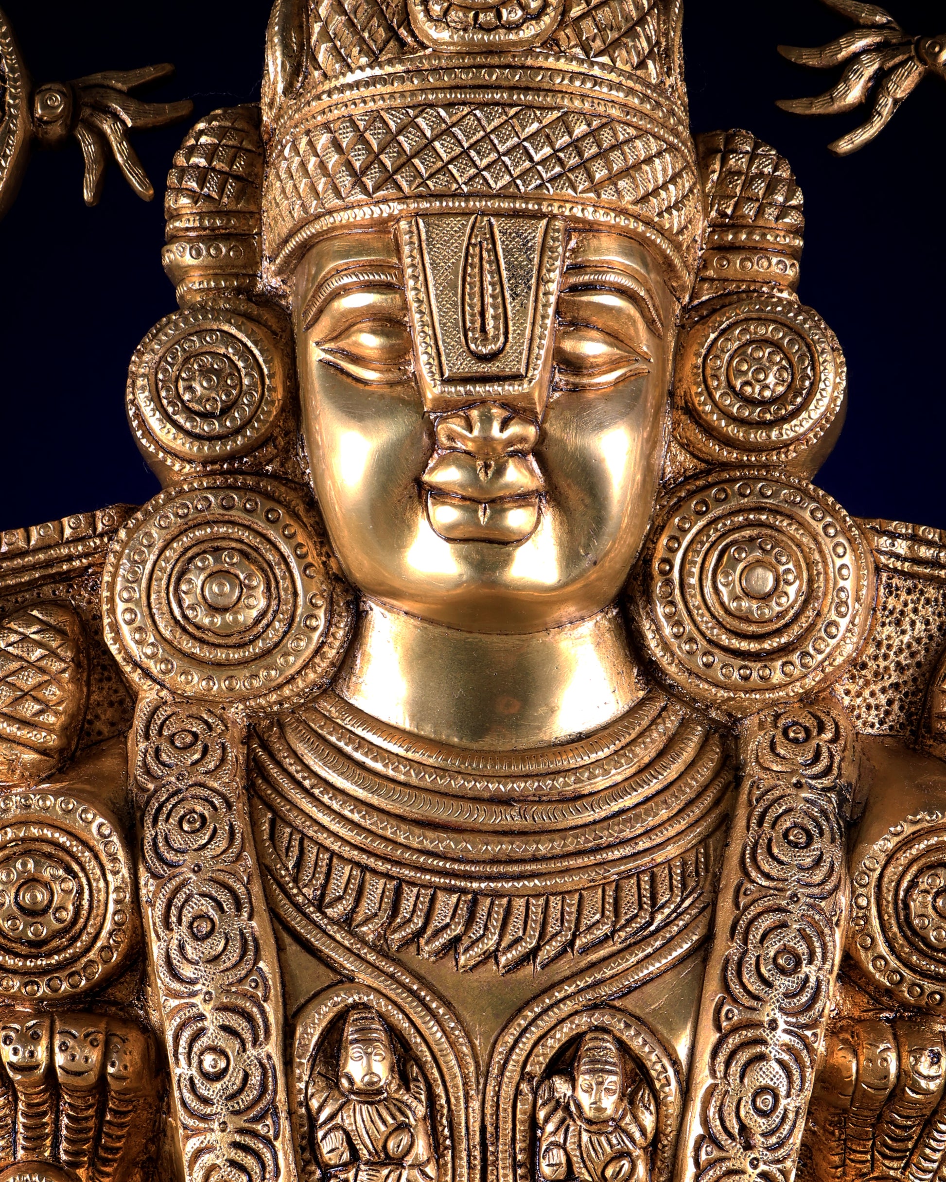 Brass Large Tirupati Balaji Statue, exquisitely engraved with Padmavathi Lakshmi. Crafted with precision and traditional temple-style detailing, this premium masterpiece exudes power, serenity, and devotion.