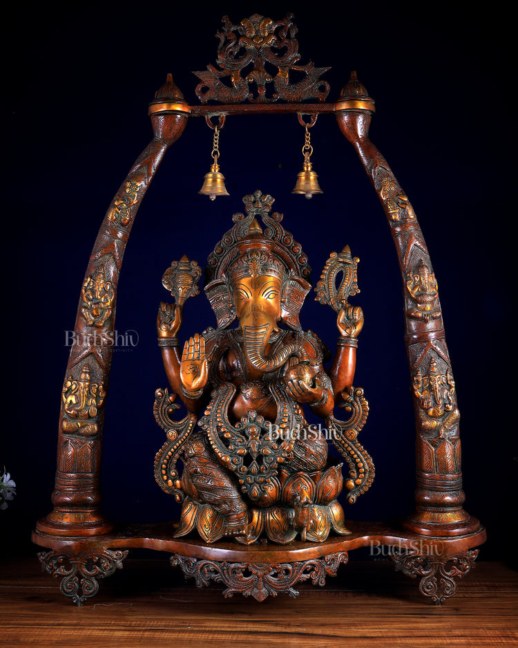 The Majestic Brass Vintage Lord Ganesha sculpture seated on a magnificent frame with Ganesha engraved pillars measures 34.5 inches in height, 27 inches in width, and 11.5 inches in depth, with a weight of 65 kgs.
