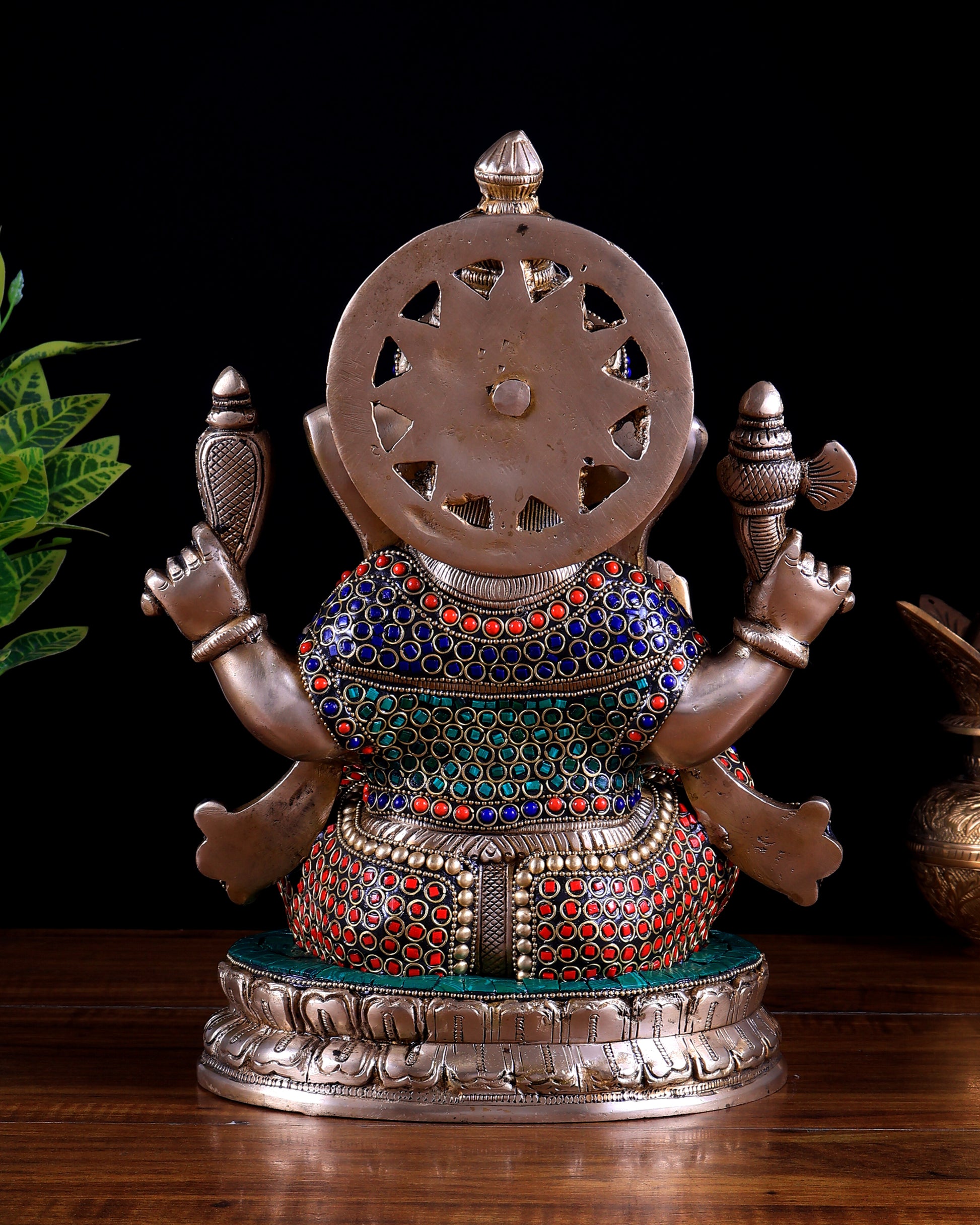 Invite divine blessings into your space with our Superfine meenakari Stonework Brass Lord Ganesha Statue. Standing at 12.5 inches, with a width of 9 inches, a depth of 6 inches, and a weight of 8 kg