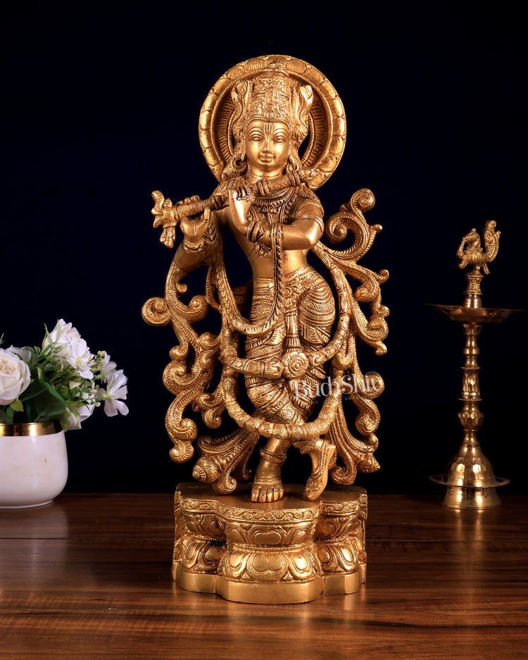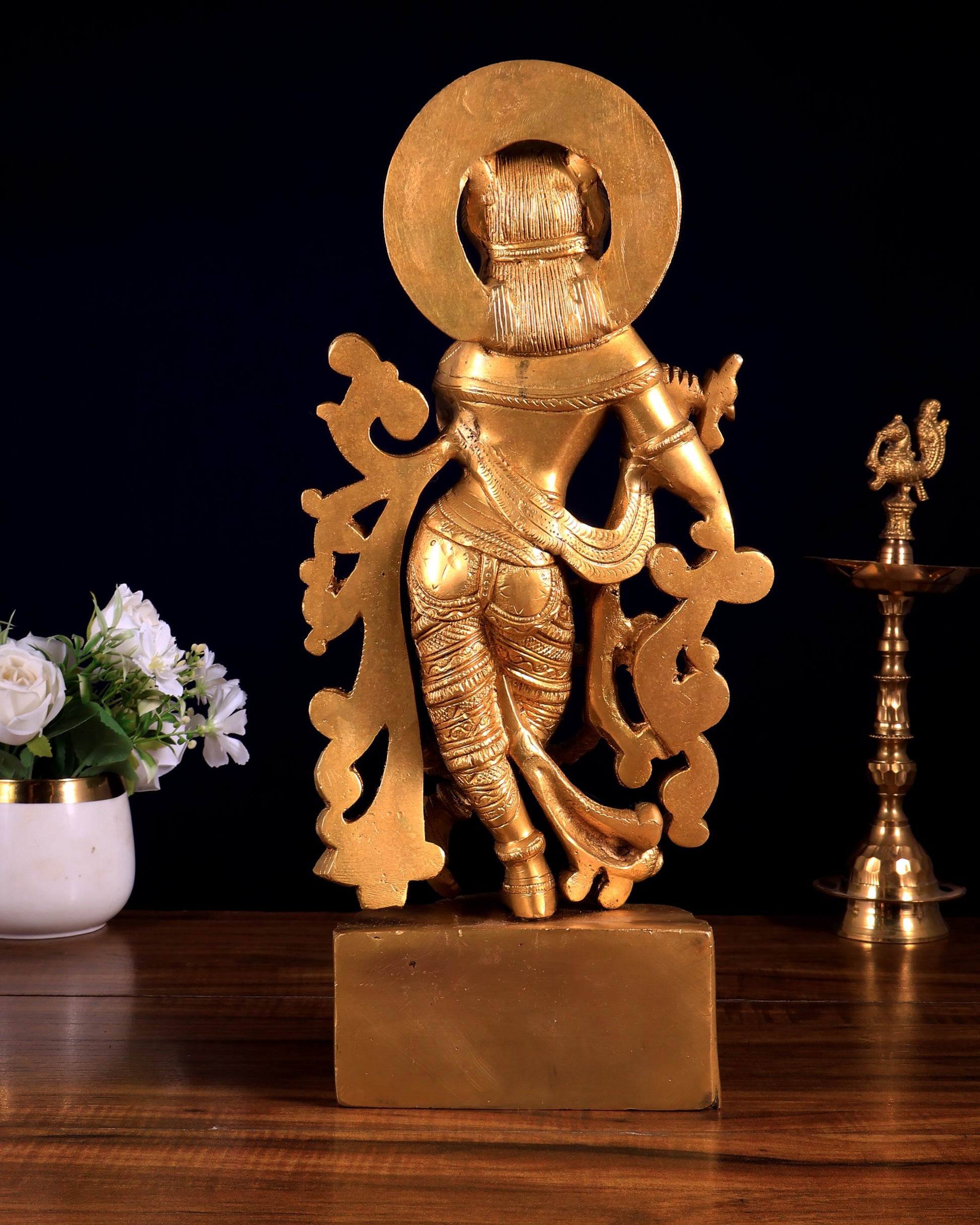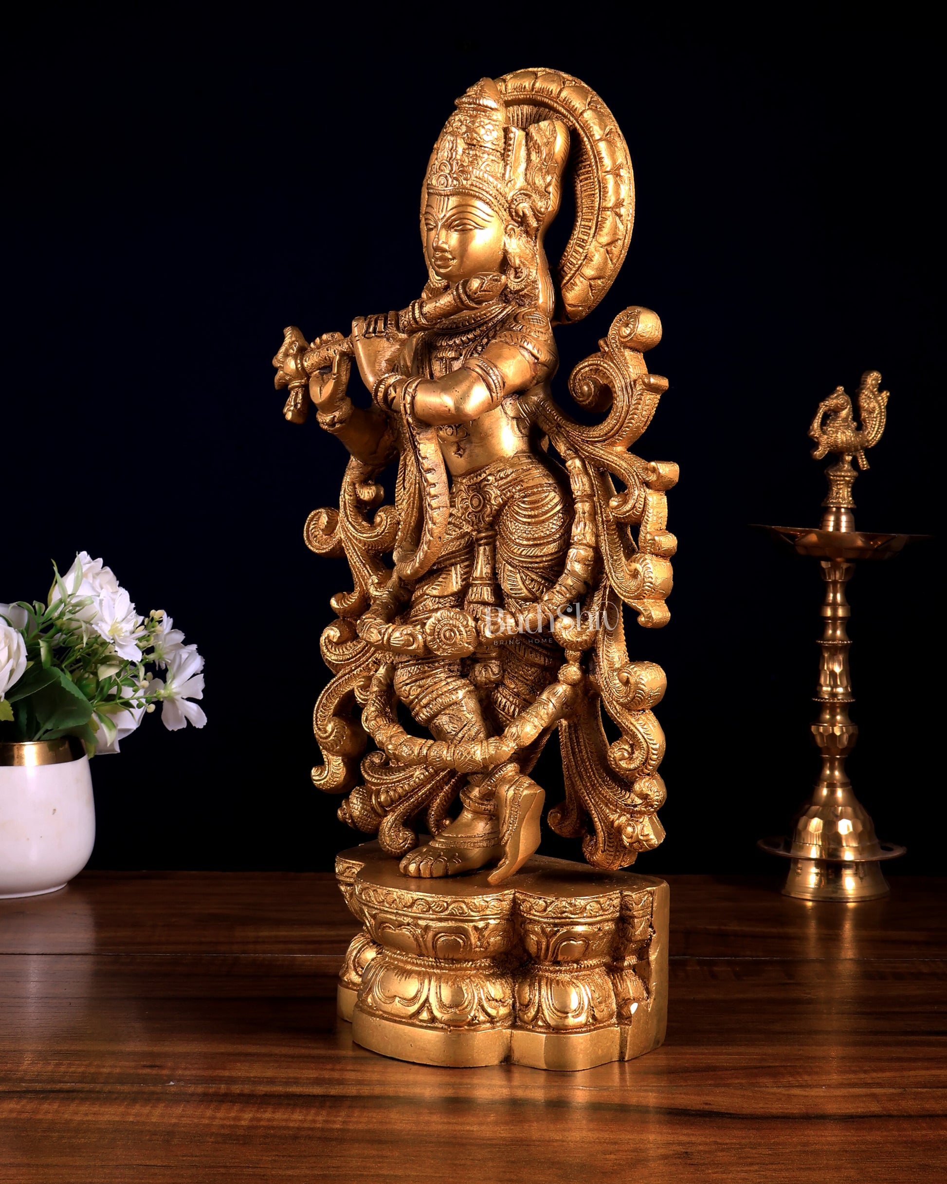 Brass Superfine Lord Krishna Statue. Standing tall at 15.5 inches, featuring a width of 7 inches and a depth of 3.5 inches, this intricately crafted masterpiece weighs 6.51 kgs. Bring the spiritual aura into your home with this captivating representation.