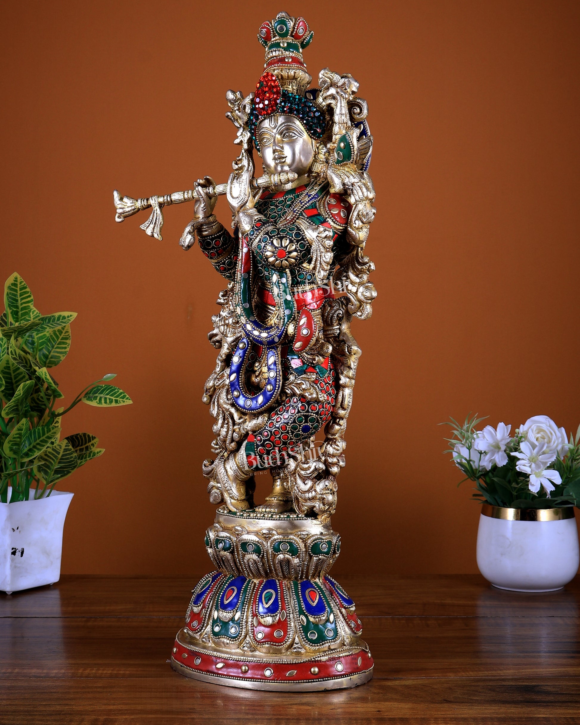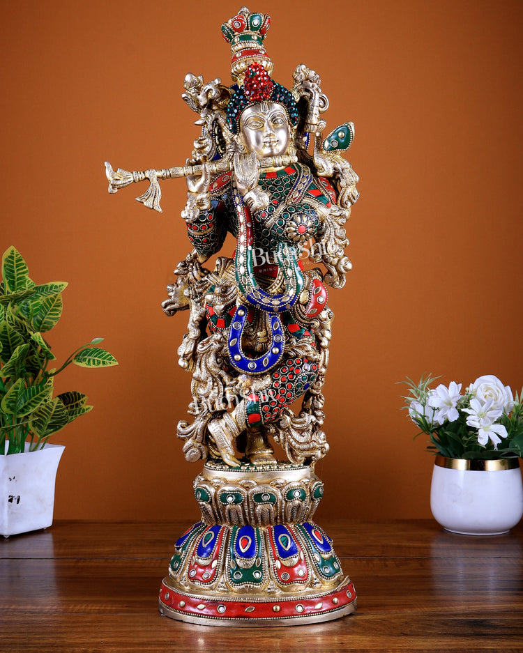 Brass Lord Krishna Statue with Stonework 21 inch tall