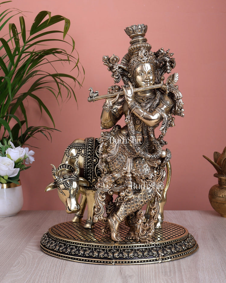 Bring home divine blessings with this superfine brass Lord Krishna with Cow statue, beautifully handcrafted with elegant detailing. A symbol of peace, devotion, and prosperity, perfect for pooja rooms, temples, and spiritual décor.
