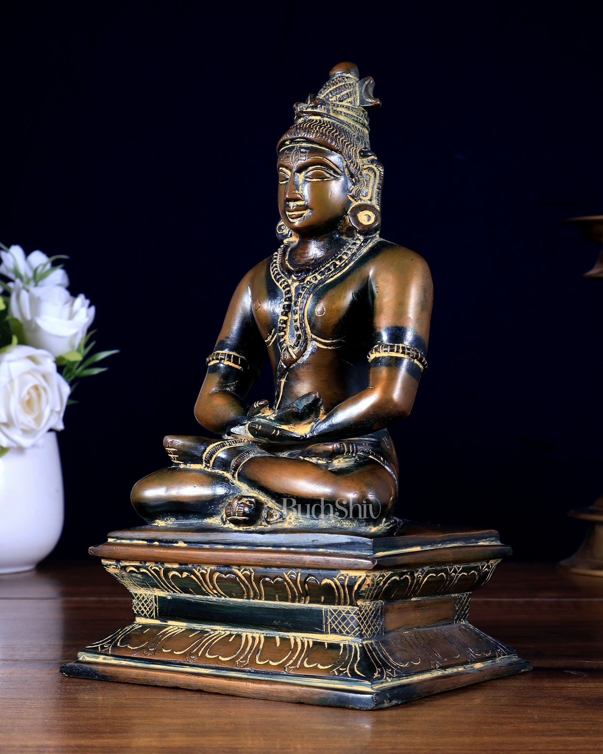 Brass Mahayogi Shiva in Meditation Idol in an super antique tone. 8.5 inches in height, 5.25 inches in width, and 4.25 inches in depth, this finely crafted statue weighs 2.9 kg. Perfect for adding a touch of spiritual serenity to your home, office, or place of worship.