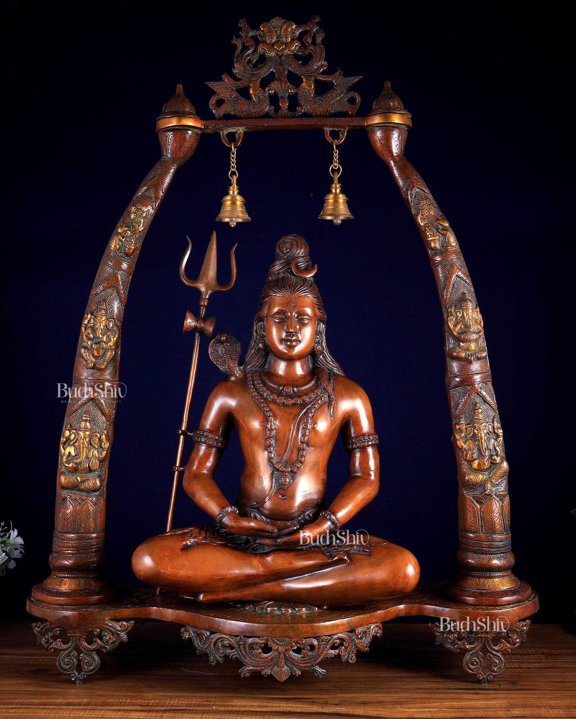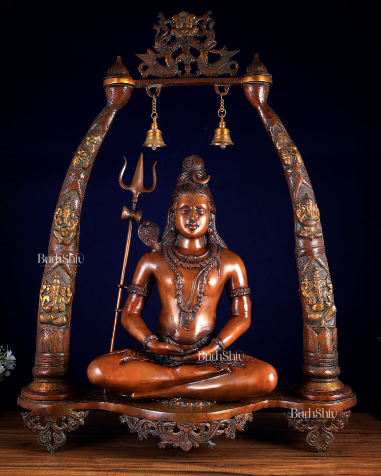 Bring home an extraordinary masterpiece of devotion and craftsmanship with this Pure Brass Lord Shiva in Meditation Statue, flanked by intricately engraved Ganesha design pillars. This imposing artwork captures Lord Shiva’s serene meditative posture while the twin pillars, carved with the image of Lord Ganesha, add divine protection and auspiciousness to the composition.