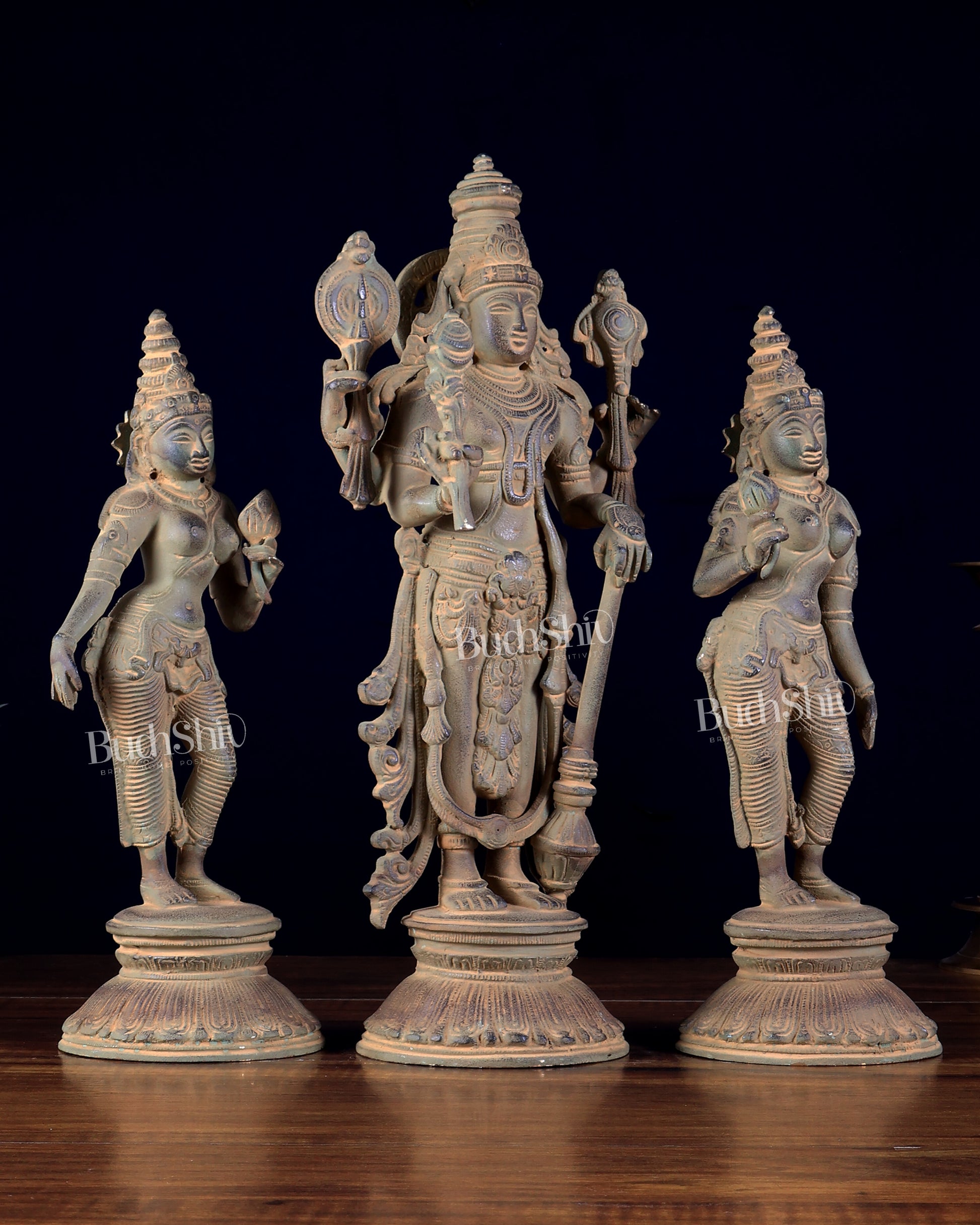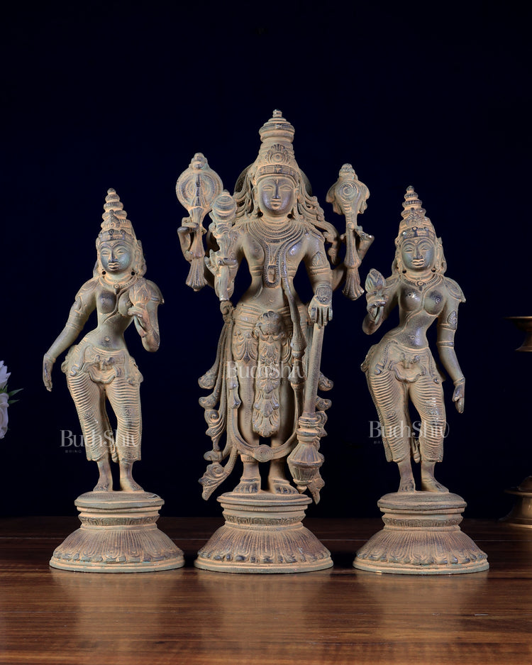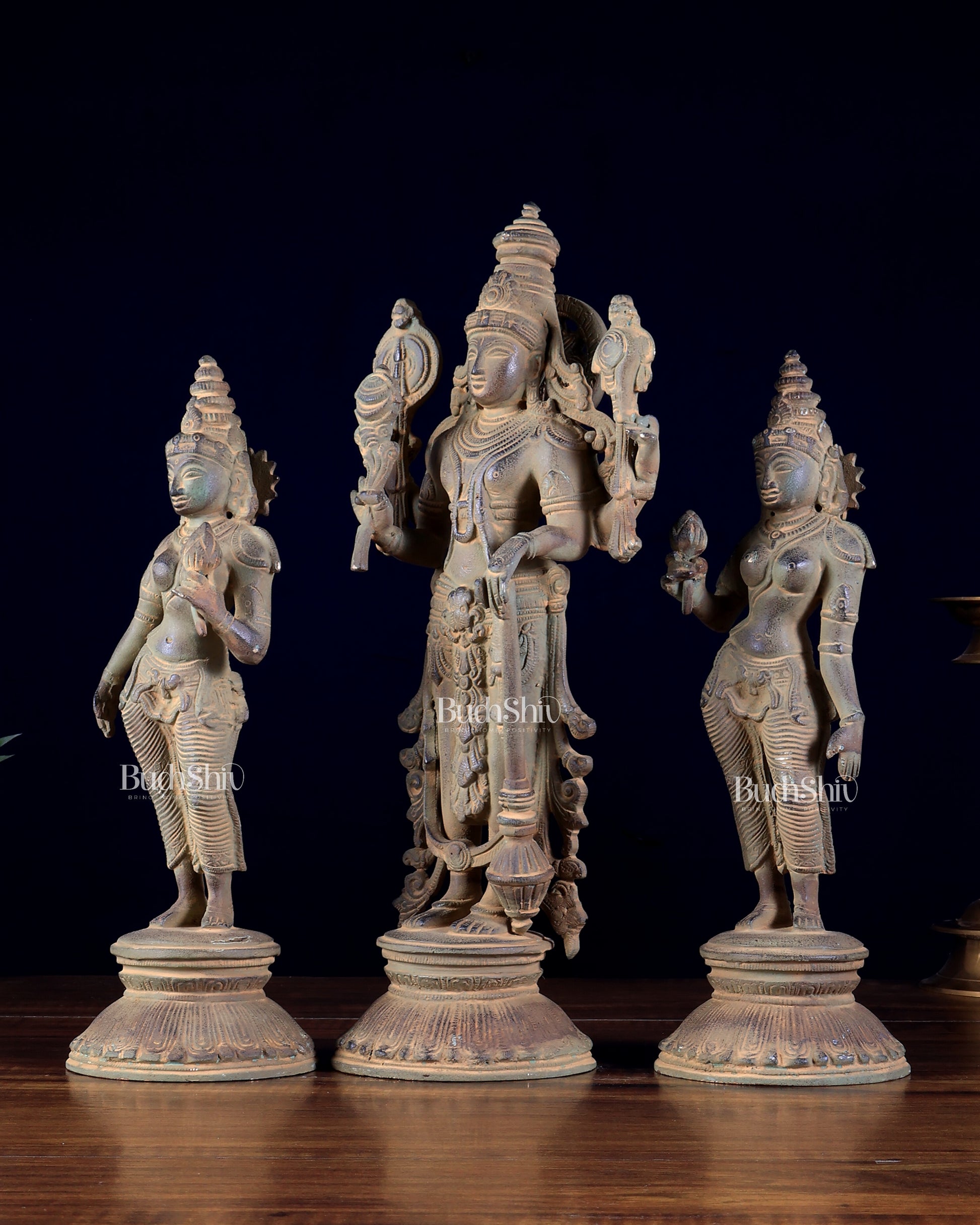 Brass Lord Vishnu with Bhudevi and Sridevi idols – Sand Patina 13"
