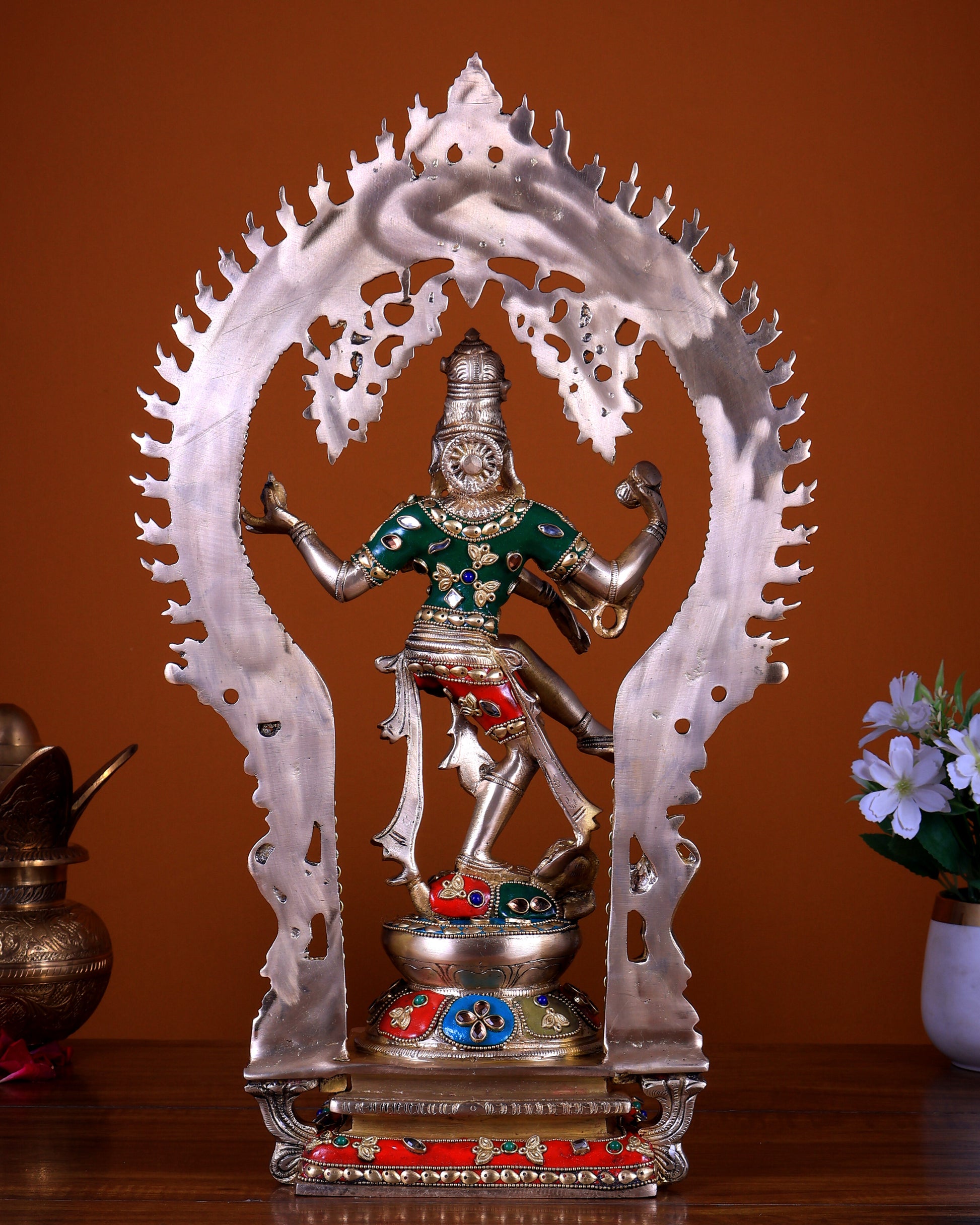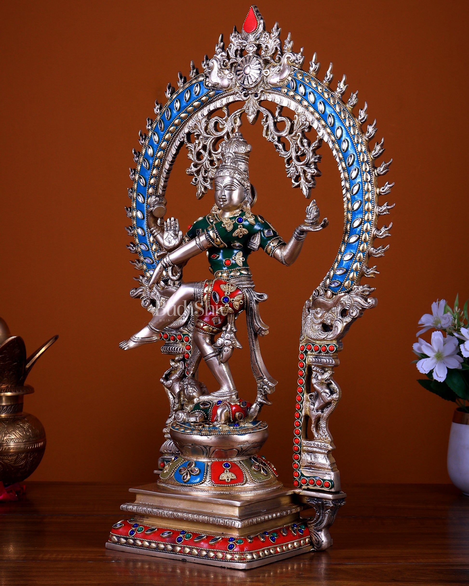 Discover the BudhShiv Exclusive Brass Nataraja Dancing Shiva Superfine Sculpture with meenakari stonework. Standing 18 inches tall with dimensions of 10.5 inches in width and 4.5 inches in depth, this intricately crafted piece weighs 7 kgs. Perfect for bringing divine energy and artistic beauty to your space.