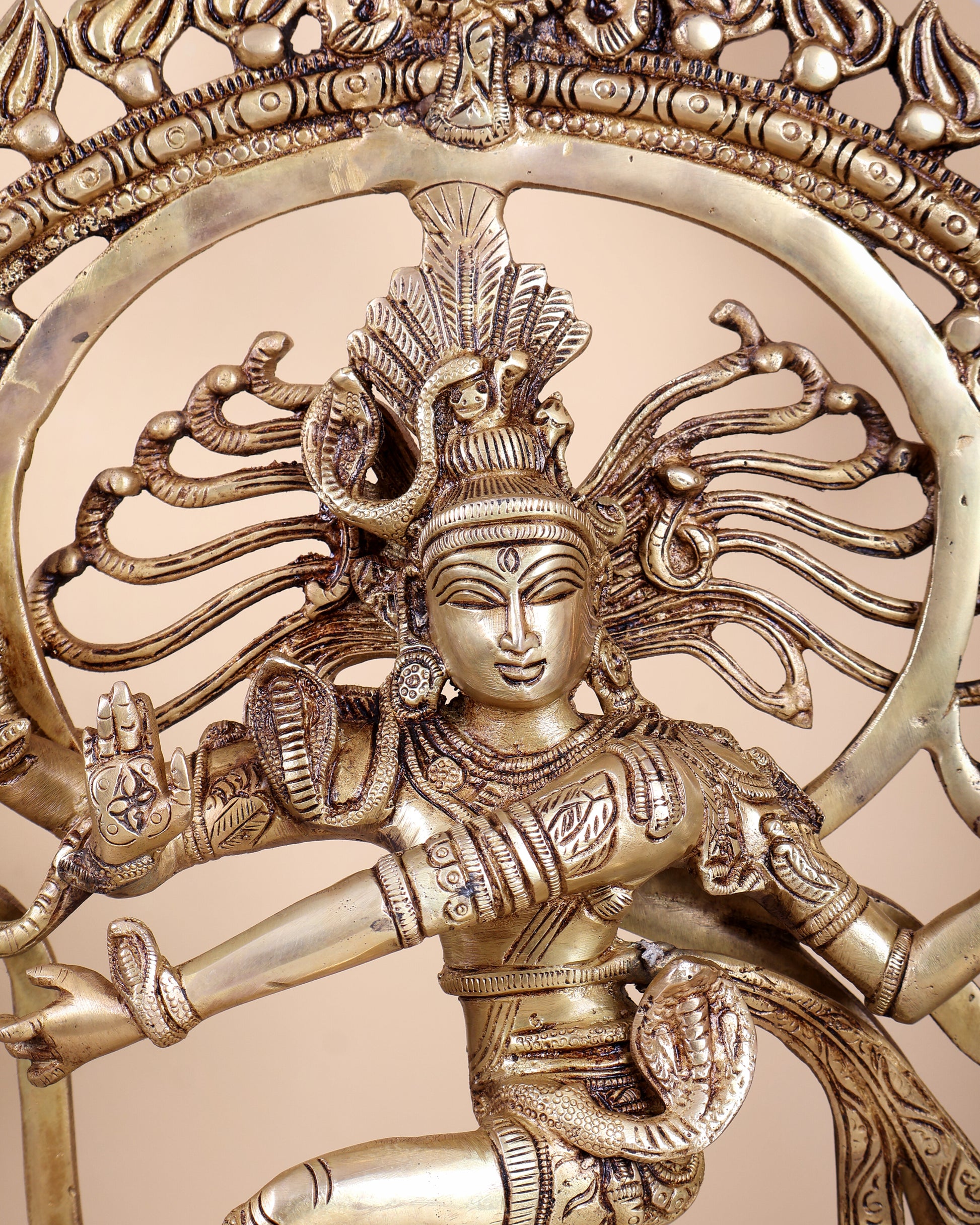Brass Nataraja statue with om backdrop. Intricate carvings