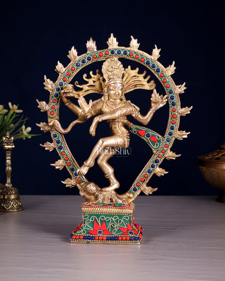 Brass Nataraja with Oval Ring floral stonework 9.3"