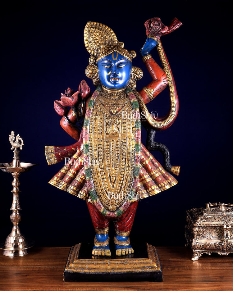Capture the essence of devotion with our large brass Shreenathji Nathdwara Srinath Ji murti with picheai hand paint. Height 31.5 inch, width 18 inch, depth 9 inche, base width of 12.5 inches, Weight 30 kg. Embrace the sacredness of Nathdwara tradition and invite blessings into your home with this intricately crafted masterpiece.
