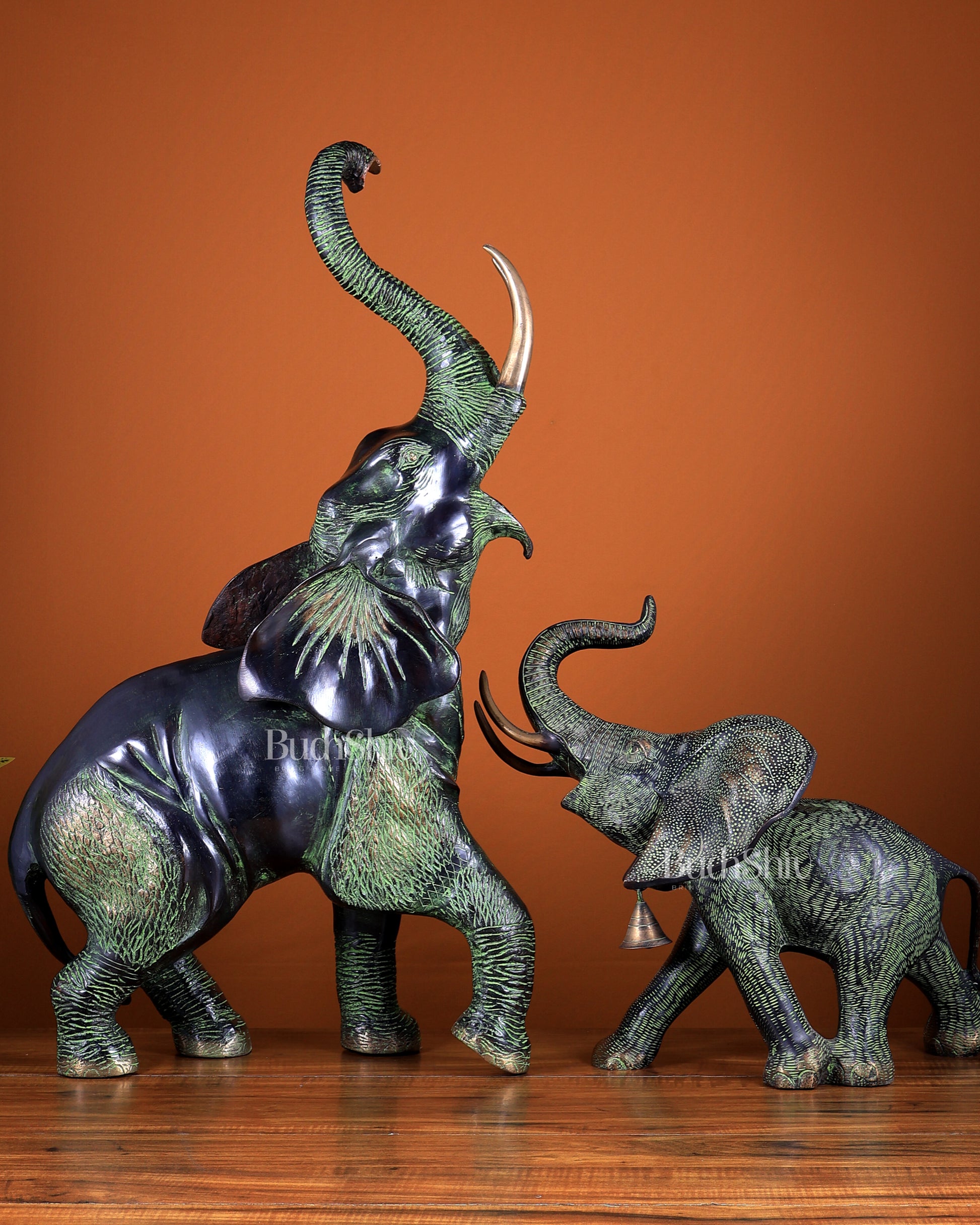 The set includes a large mother elephant and a smaller baby elephant, both beautifully detailed and designed to create a powerful visual and emotional presence in homes, offices, hotels, and curated spaces.