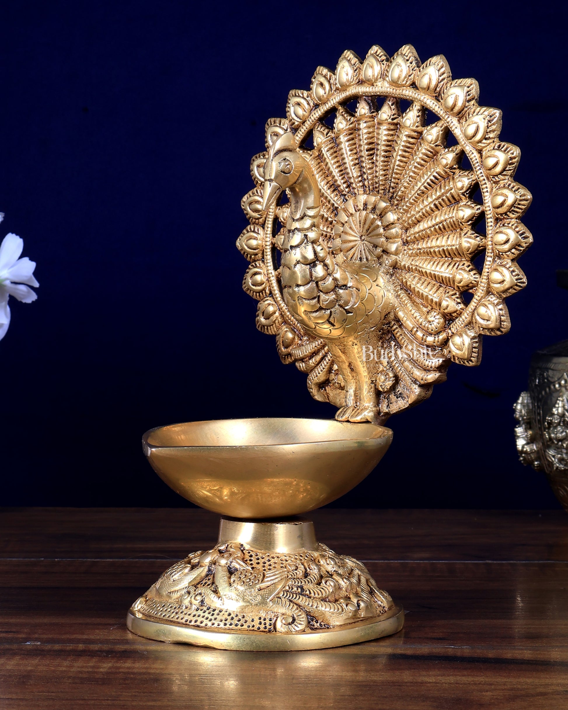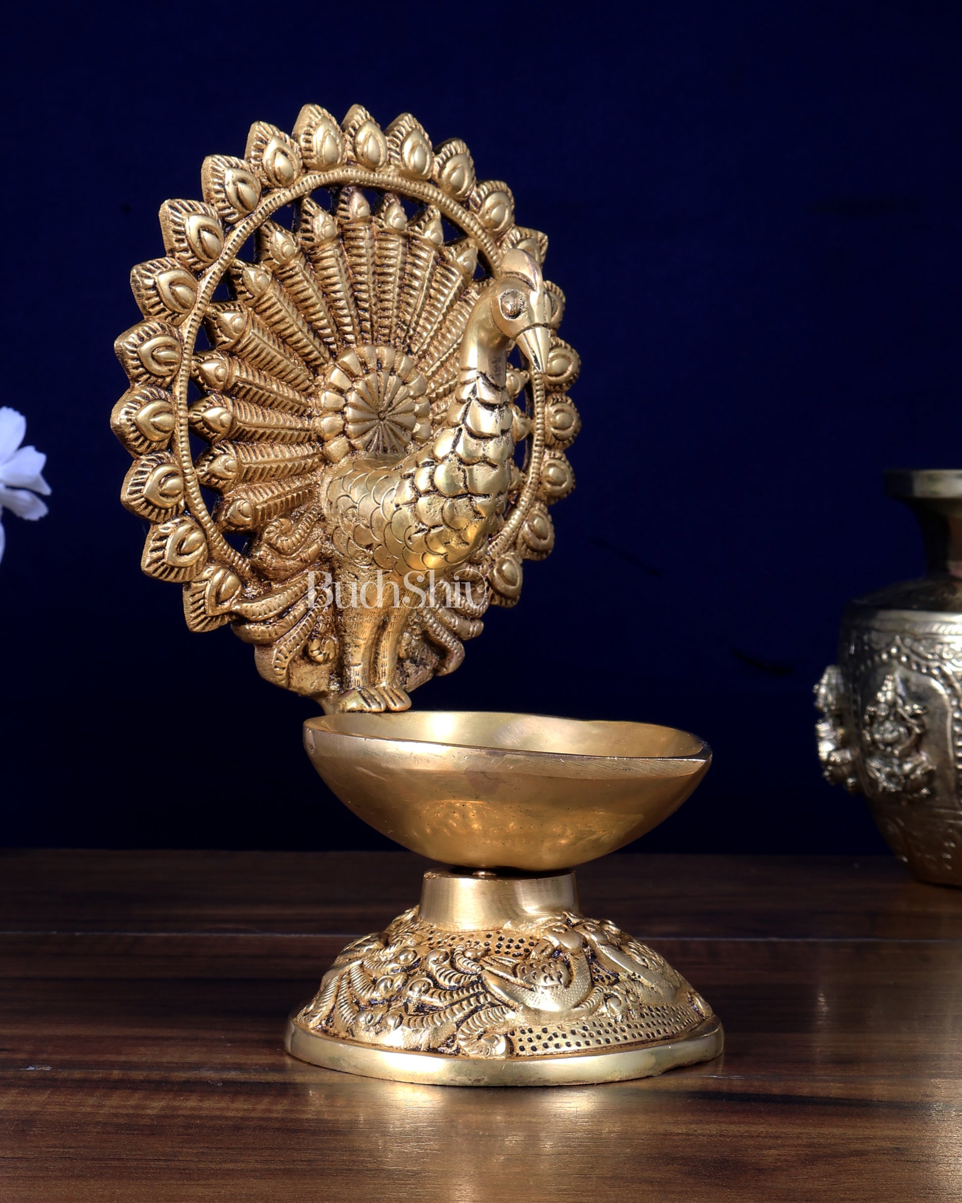 Traditional Brass Peacock Lamp diya with elegant detailing, ideal for pooja, temples and festive decor. Size 9 x 6 x 4 inches, weight 1.78 kg. Handcrafted brass deepam.