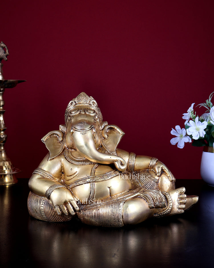 Bring serenity and elegance to your space with this unique brass resting Lord Ganesha statue. Expertly crafted for home décor and gifting, it measures 20.5 × 25.5 × 18 cm (8.1 × 10 × 7.1 inches) and weighs 7 kg, making it a solid, premium statement piece symbolizing peace, prosperity, and wisdom.
