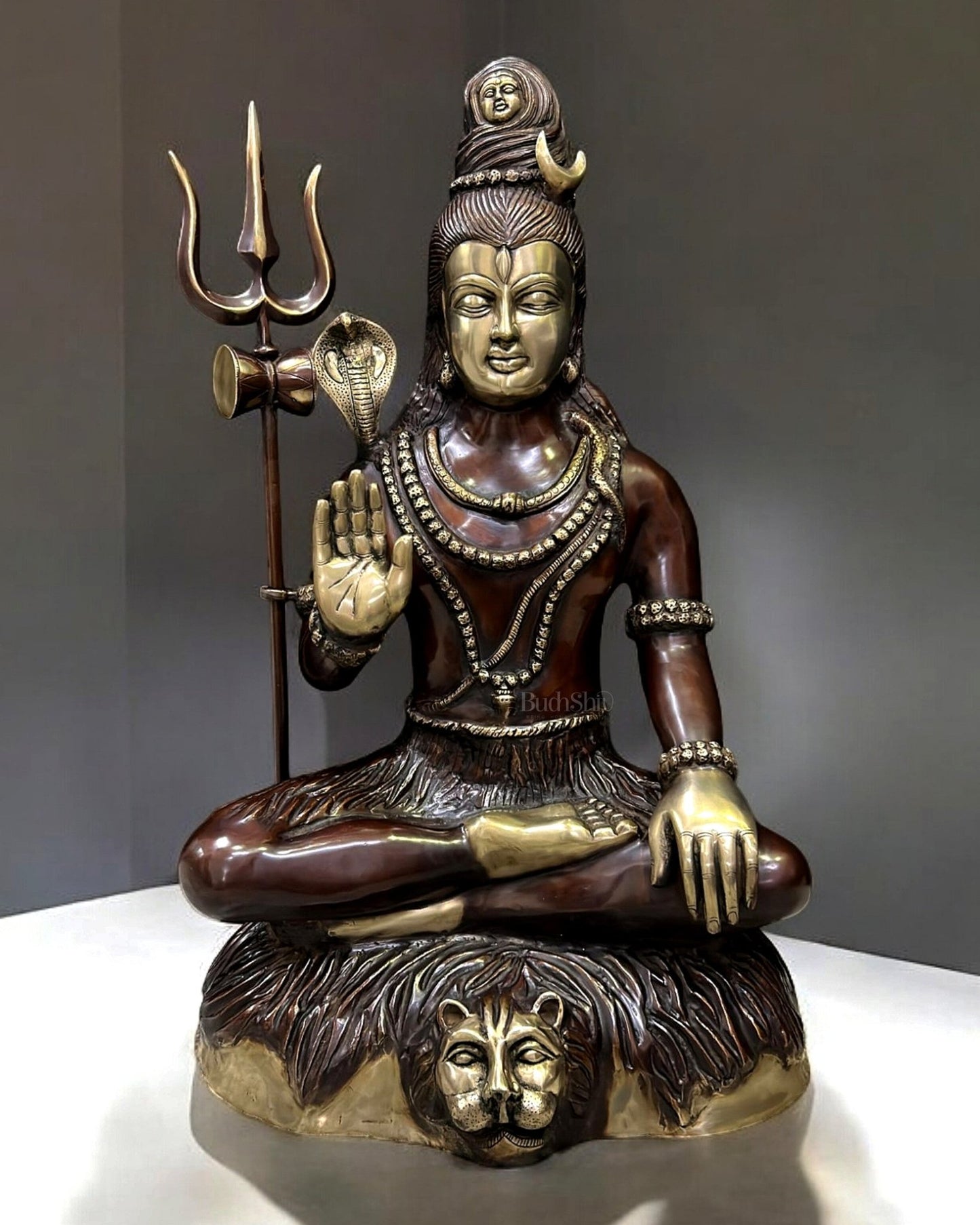 Admire the power and grace of Lord Shiva with this large handcrafted brass statue in Dhyana Aashirwaad Mudra. Standing 35 inches tall with a width of 21 inches and a depth of 16 inches, this 42 kg masterpiece features a unique butter gold finish. A stunning addition to any space, crafted by skilled artisans from North India.