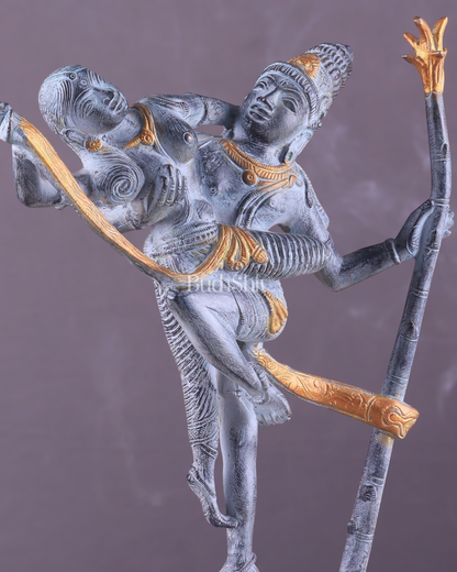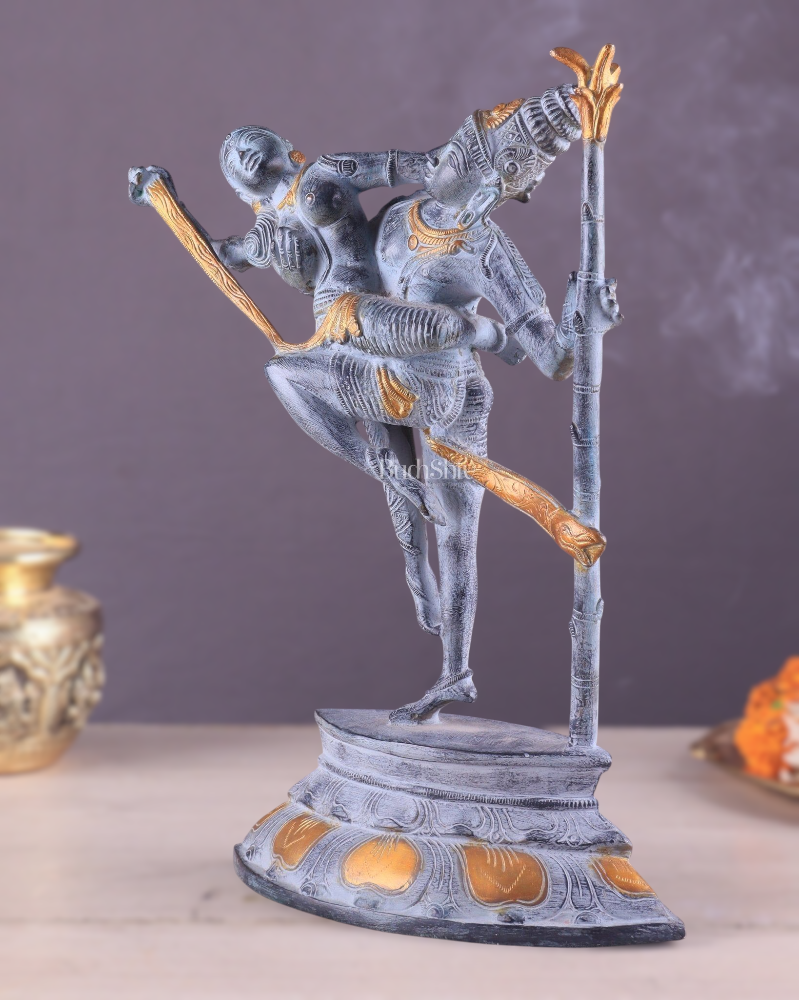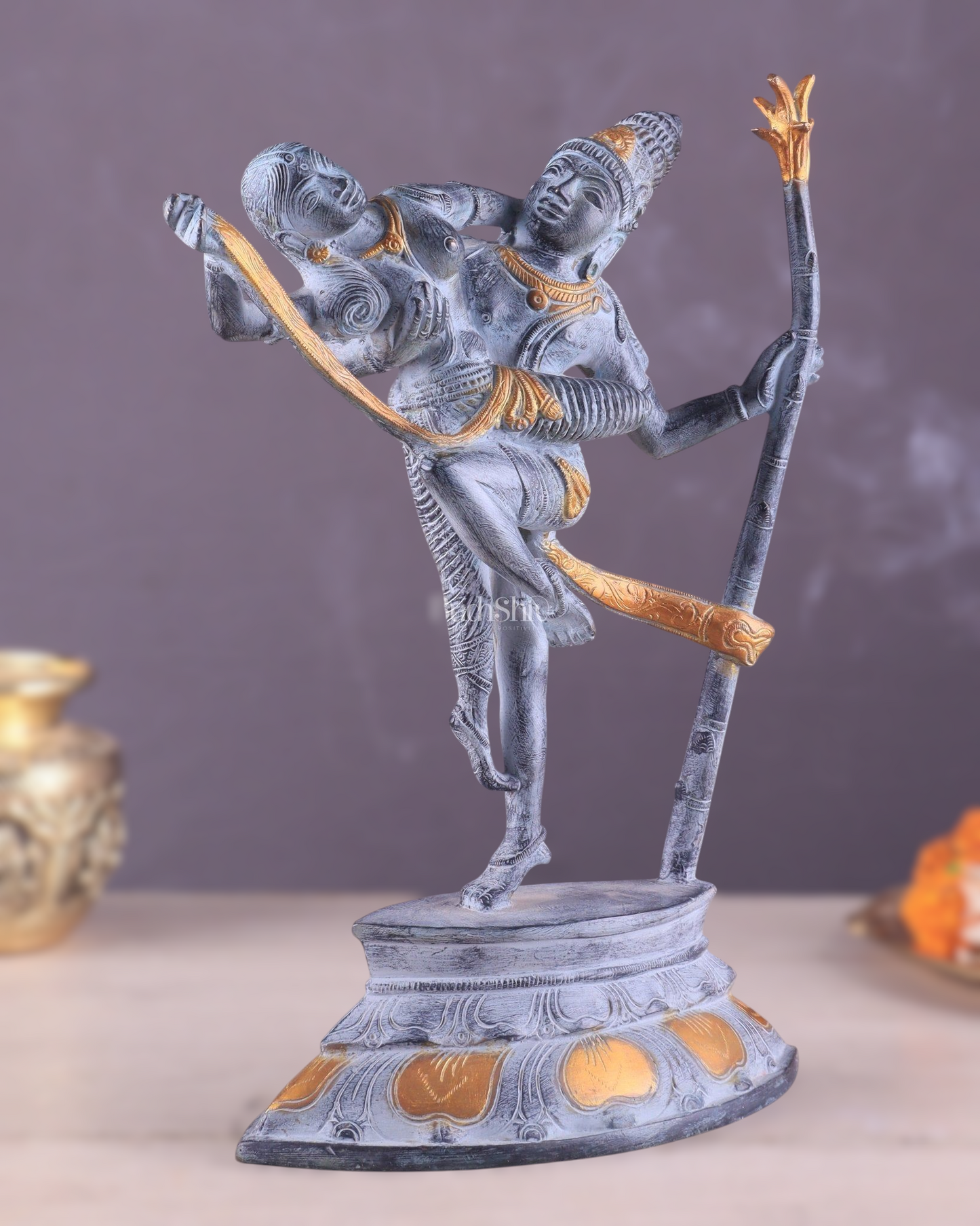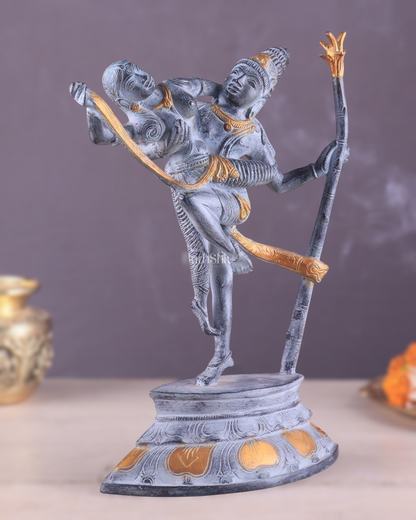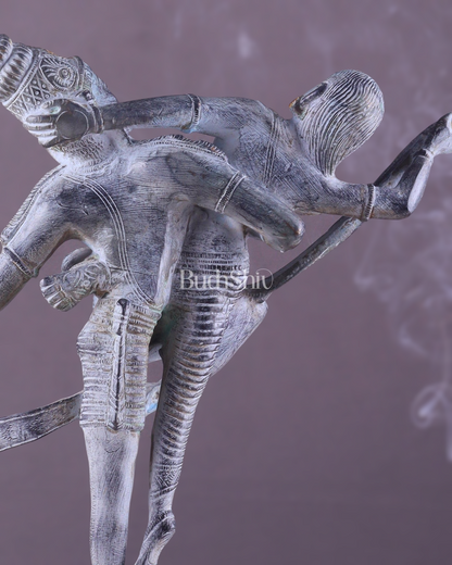 Experience the eternal dance of love and desire with our exquisitely crafted Brass Superfine Dancing Rati and Kamadeva Statue. Standing gracefully at 13 inches in height, with a width of 10 inches and a depth of 4 inches, this intricately crafted statue weighs 6 kgs. Vintage grey sandstone finish.