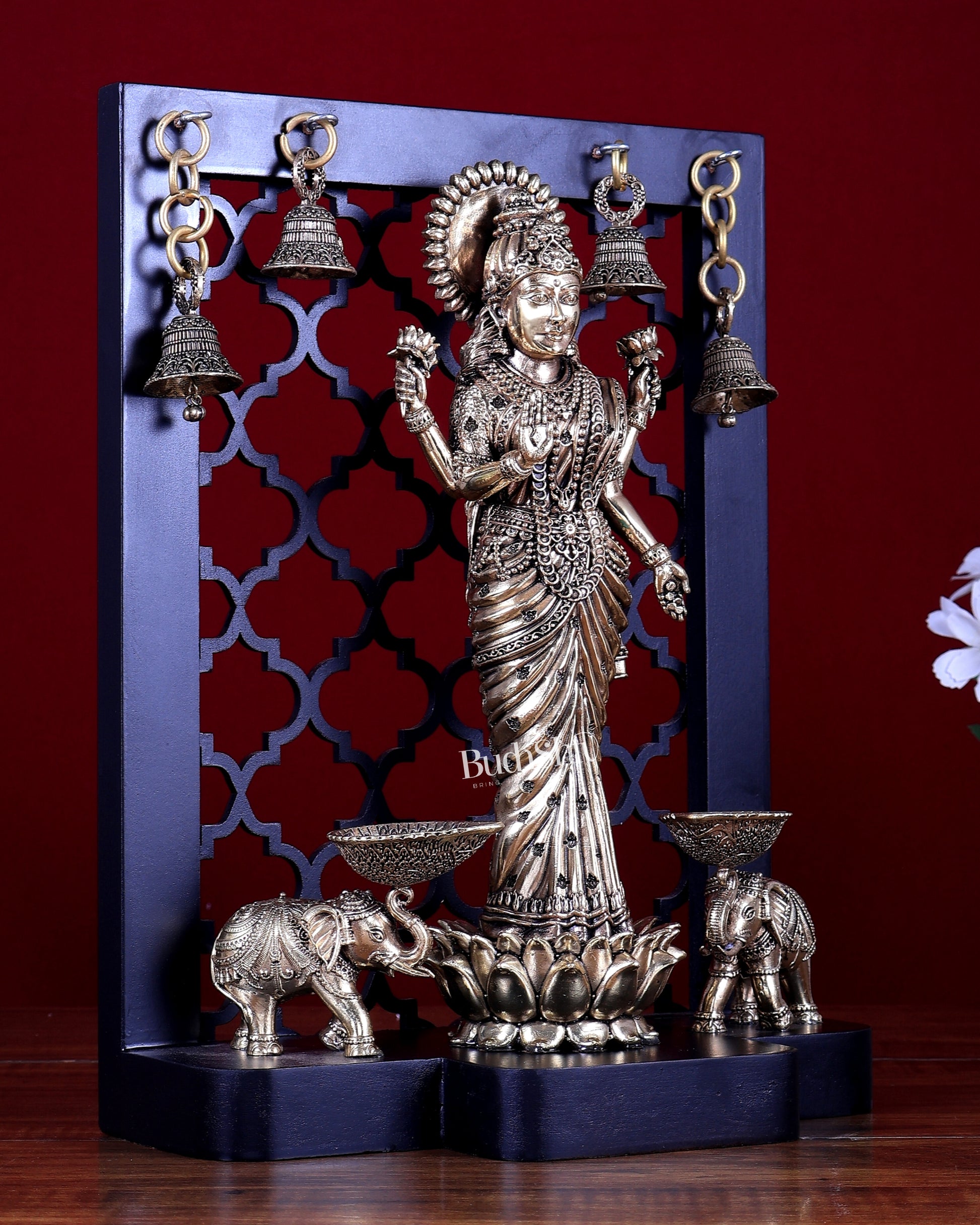 This Brass Superfine Gaja Lakshmi statue, beautifully mounted on an MDF temple frame, features dual elephant diyas and hanging bells, symbolising wealth, prosperity, abundance, and auspicious beginnings. The presence of elephants enhances the sacred meaning of Gaja Lakshmi, representing royal grace and divine blessings.