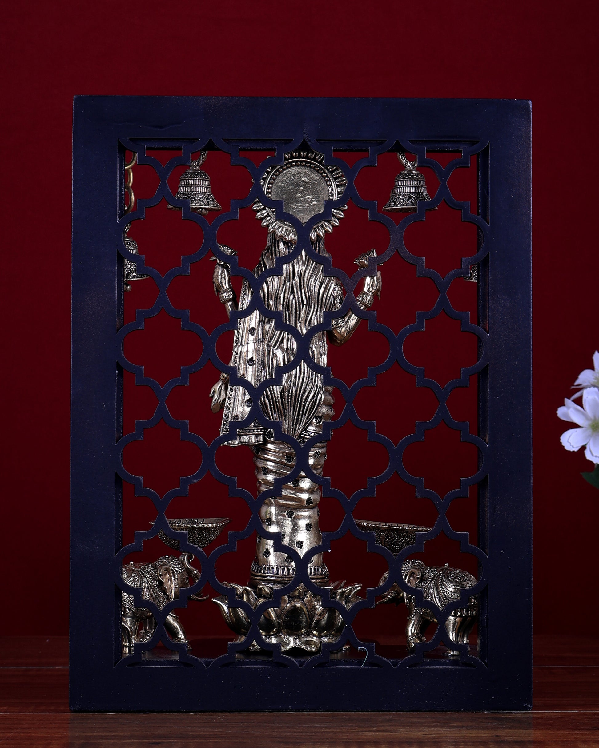 Crafted in brass superfine using traditional metal casting techniques, this complete temple-frame setup is ideal for home pooja rooms, mandirs, offices, and prosperity-focused gifting.