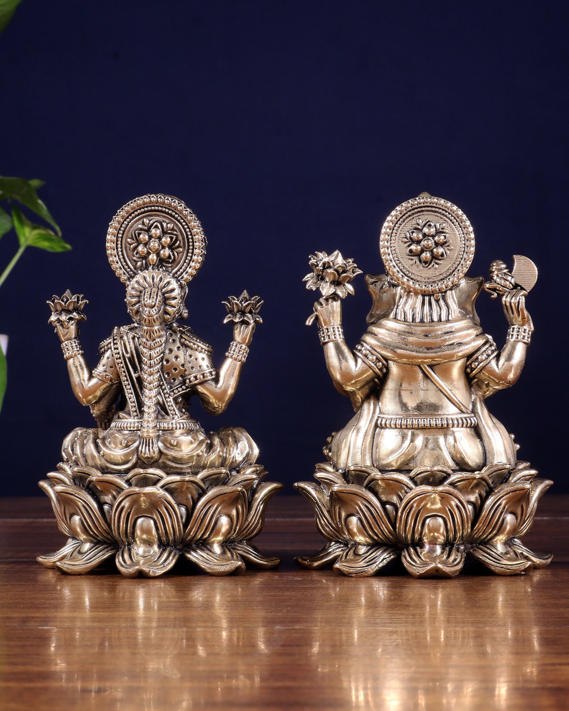 A beautifully handcrafted Pure Brass Ganesha and Lakshmi idol set seated gracefully on a lotus base. Symbolizing wisdom, prosperity, and good fortune, this superfine idol is perfect for pooja rooms, festive décor, and auspicious gifting. Its compact size makes it ideal for homes and offices alike.