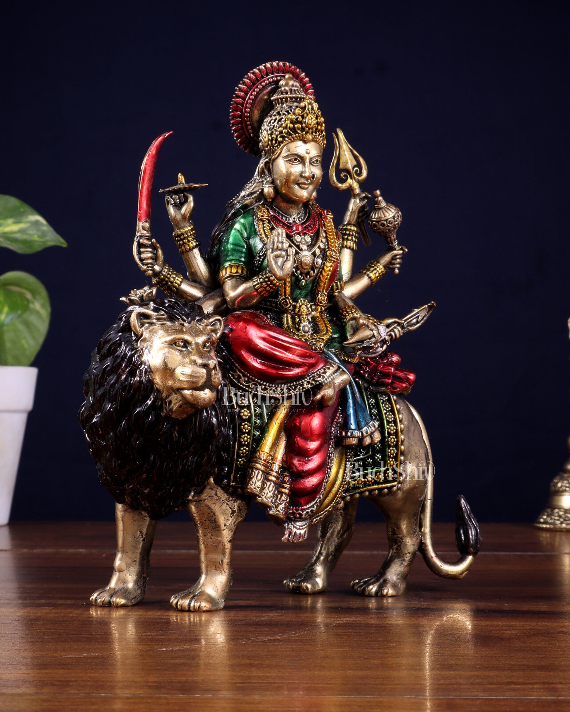 Brass Superfine Goddess Durga Ambe Mata sitting on a lion, beautifully hand-painted. Sherawali mata,  Standing 8 inches tall, with dimensions of 7 inches in width and 3 inches in depth, this intricately crafted statue weighs 1.040 kg. Perfect for invoking the divine strength and blessings of Goddess Durga.