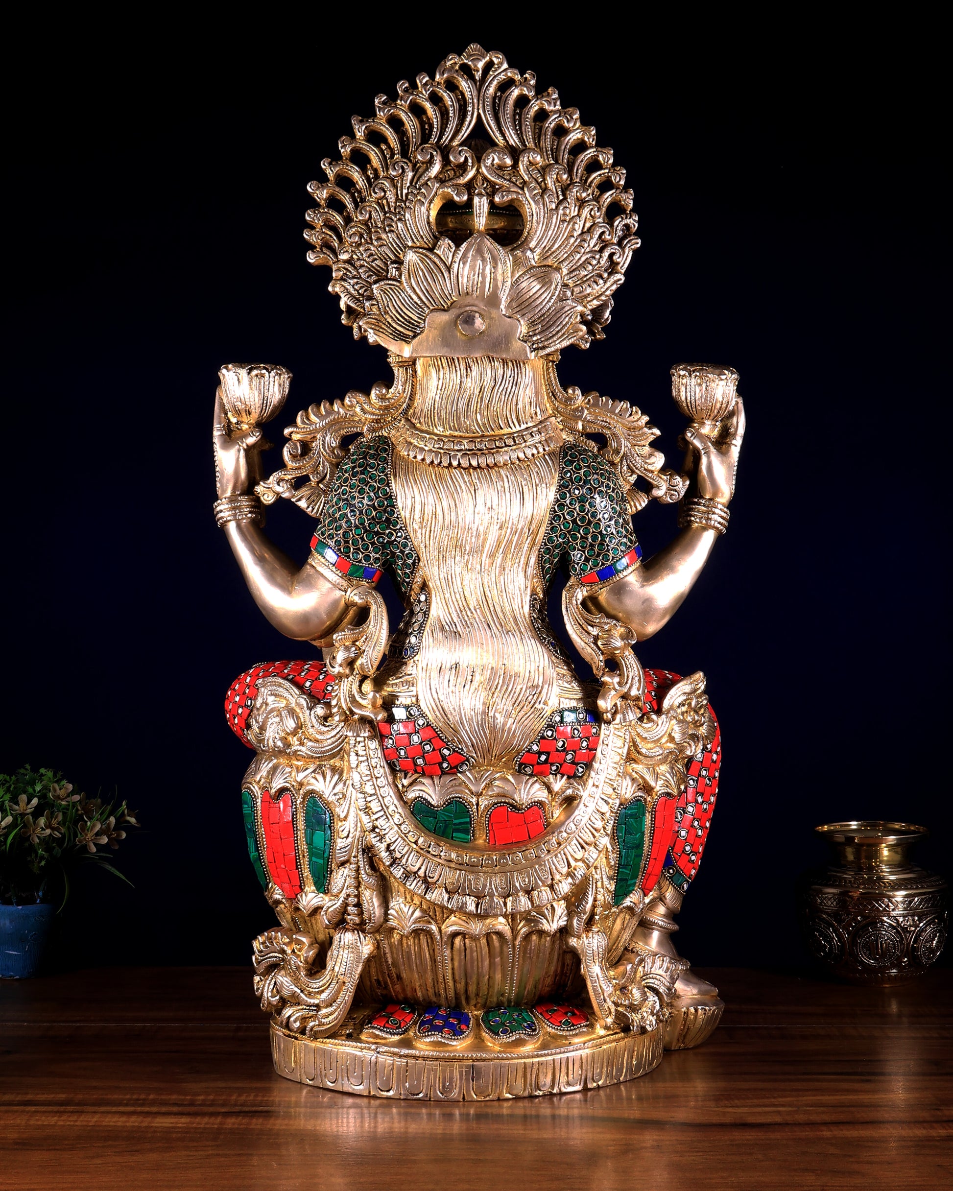 Brass Superfine Goddess Lakshmi Statue with meenakari Stonework. Height 25 inches tall, 13 inches wide, and 7.5 inches deep, and weighing 29 kg, this large and intricately crafted statue exudes grace and prosperity. Perfect for enhancing your home with the blessings and elegance of Goddess Lakshmi.